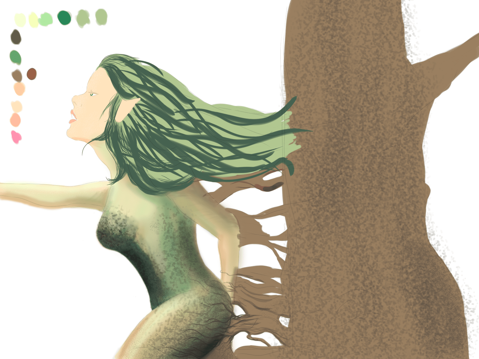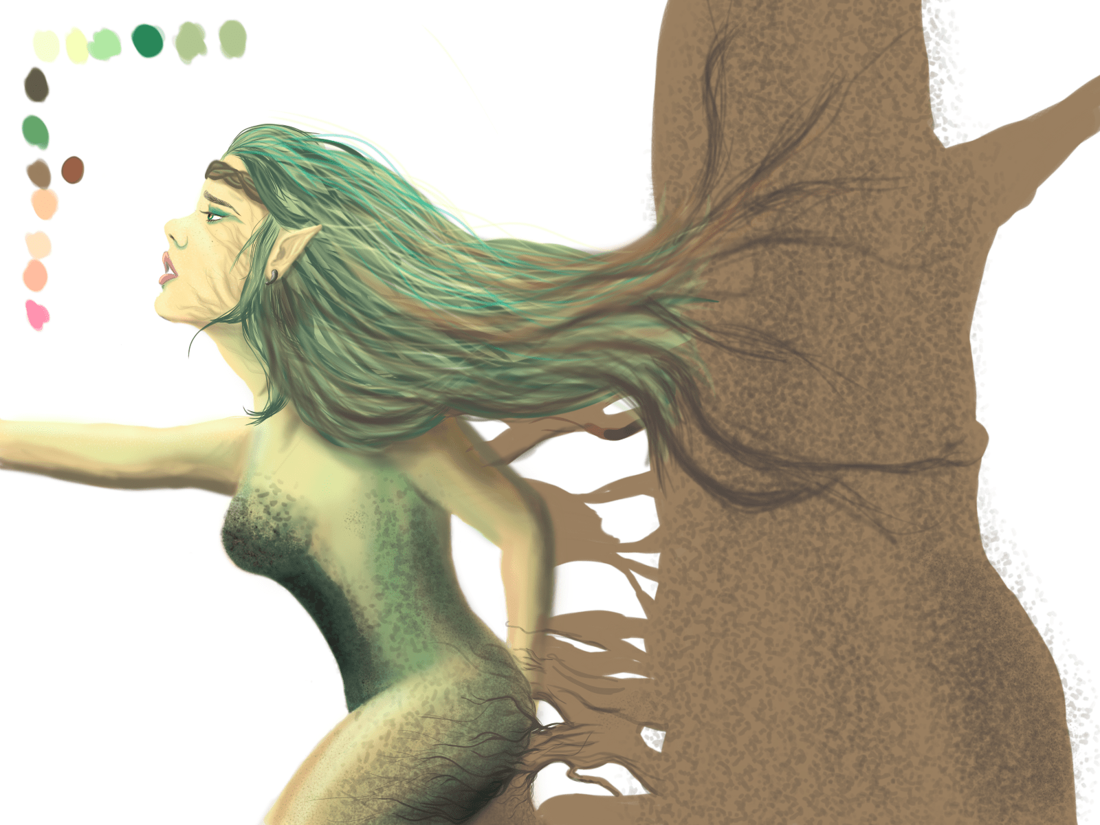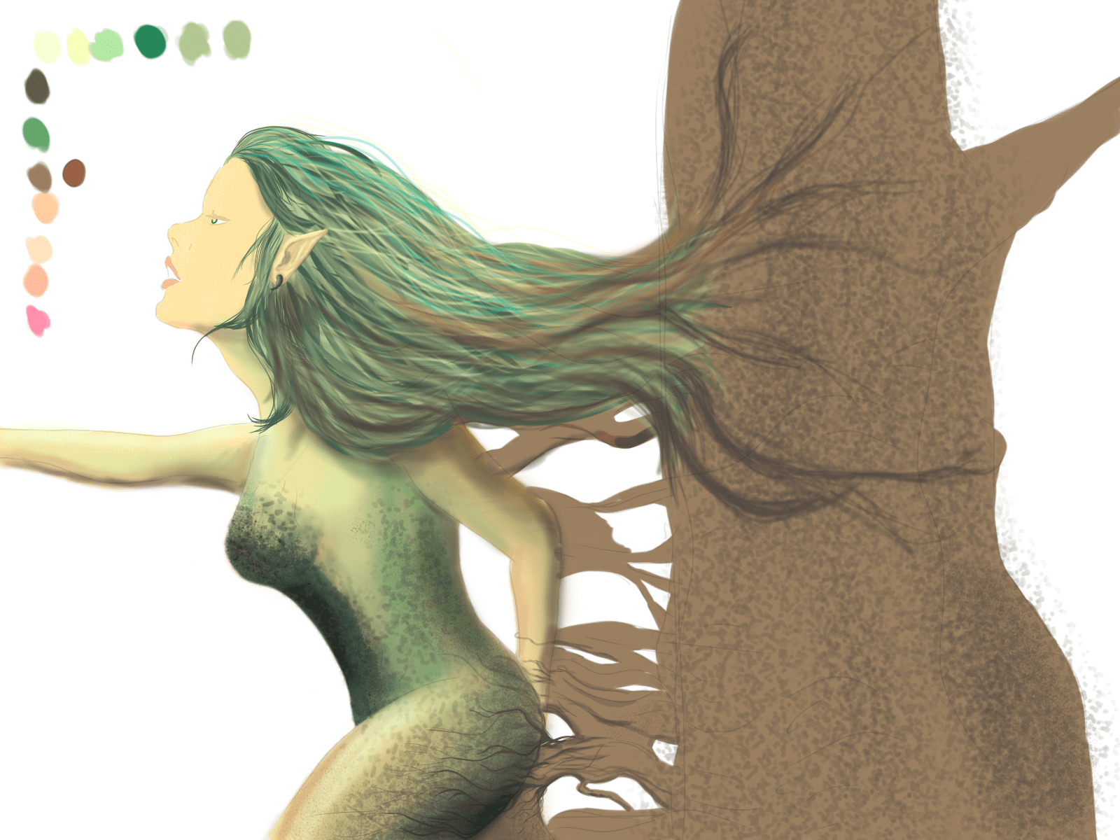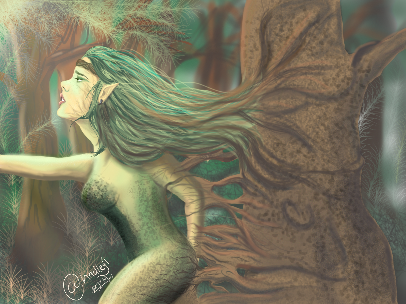 Therefore, the background I have given to this Dryad has been a forest environment, but somewhat unfocused and not very detailed. For him I have also used a sketch, in this I have established a fucking escape, or a little perspective, so that our illustration will not look so "flat".Compared to the total time it took me to complete the character (about 10 hours), the background was really fast (about 1 hour), as it didn't require much detail and I had a clear idea of what I wanted to capture in it. Of course, my signature and user could not be missing, which have been added in a place near the spotlight of this beautiful Dryad.