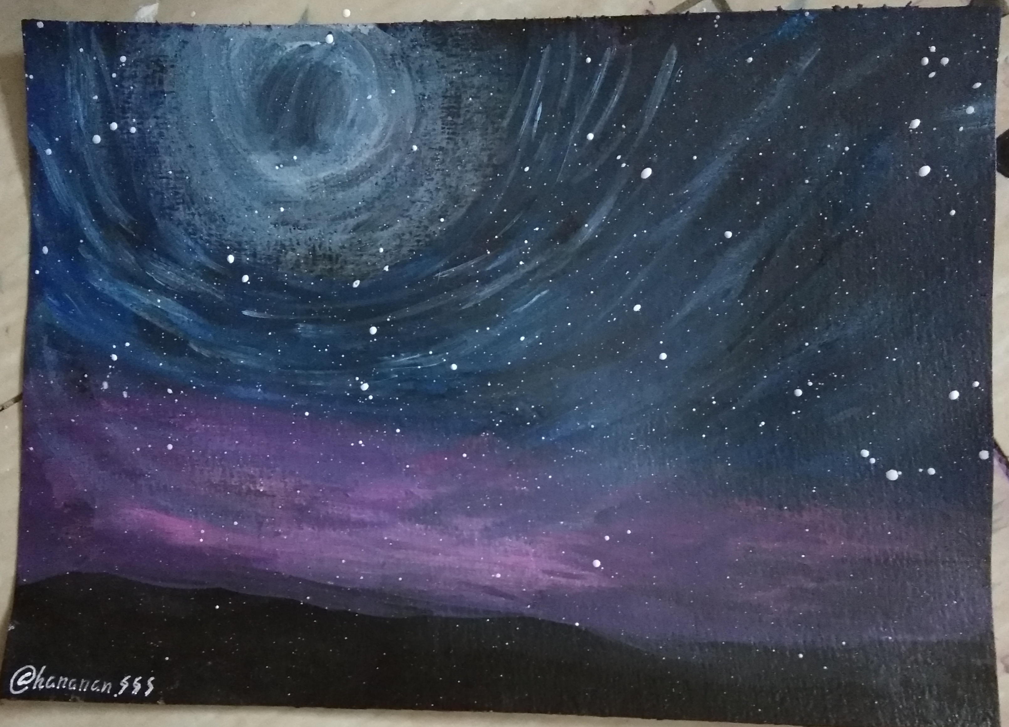 Next paint the background using violet, blue and white, after that splashing white color as the stars.