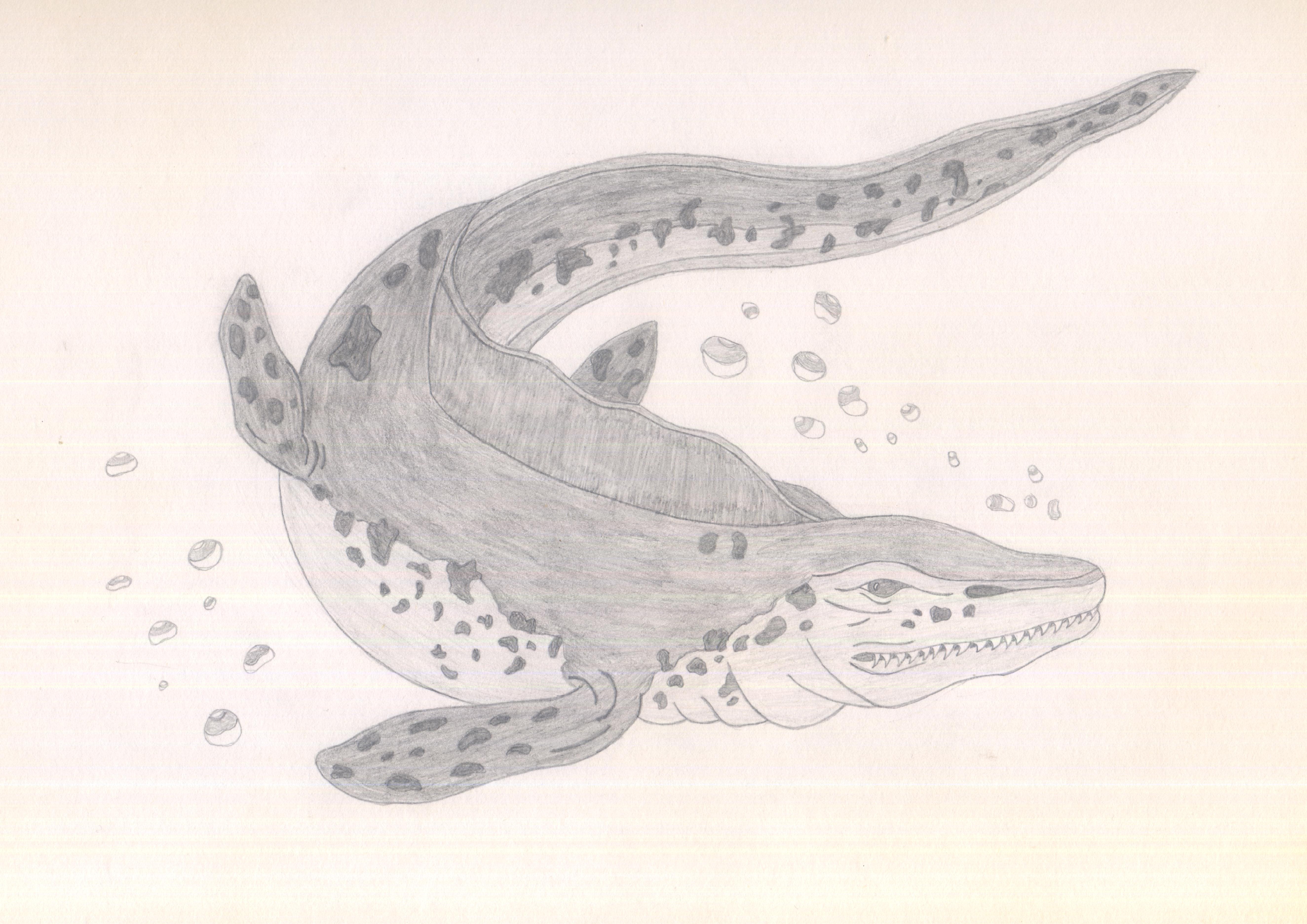 Le sigue el Mosasaurus, otro dibujo fósil, al igual que los anteriores posee trece años, pueden notar ese color antiguo que se impregna en las hojas, quizás al ser una imagen digital o debió a que el escáner no funciona del todo bien no permite apreciar ese tono pero físicamente tienen un color amarillento.