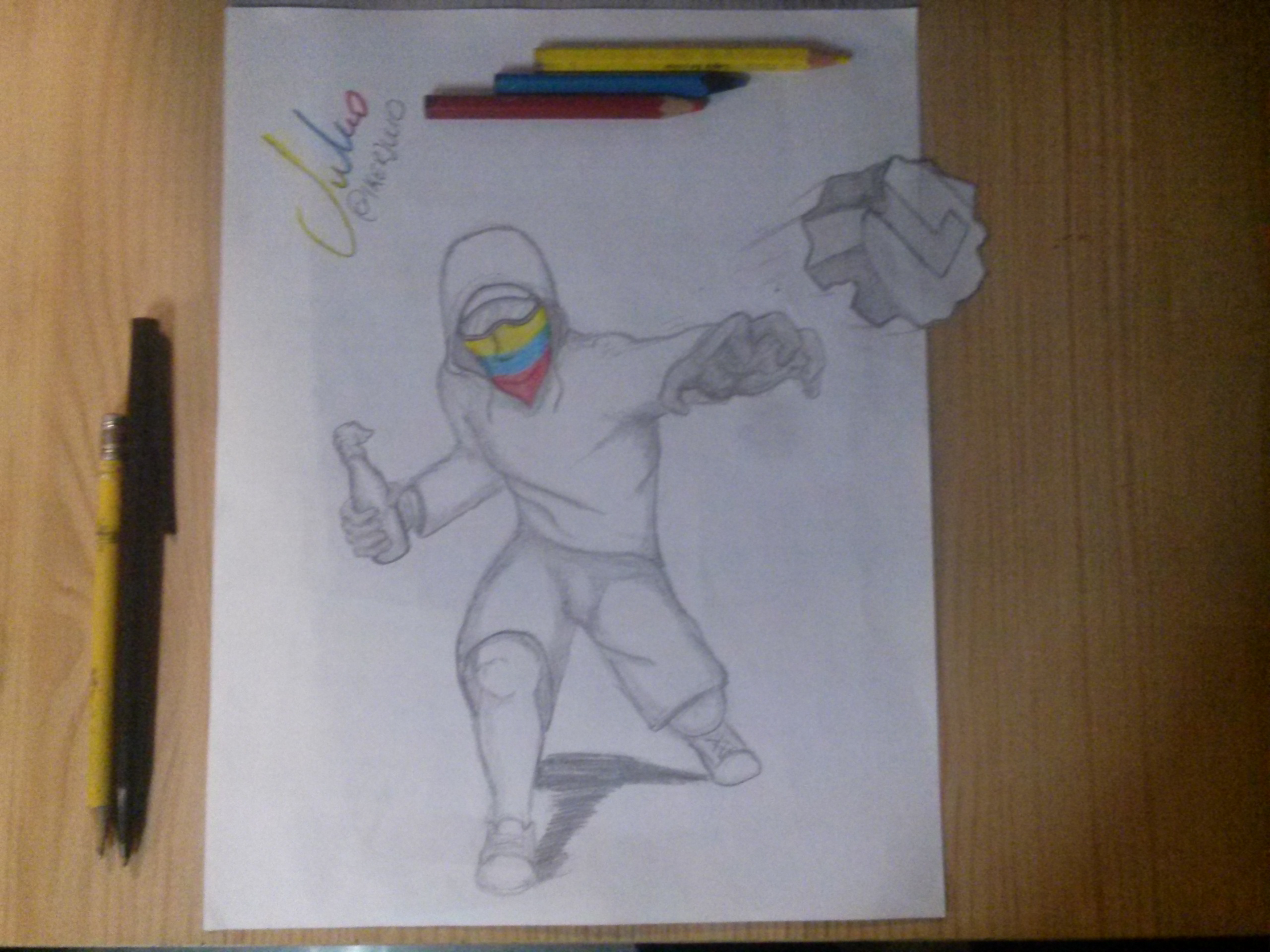 Hoy quise dibujar a los Llamados Guarimberos, un grupo de Jóvenes Venezolanos que armados con piedras, palos, molotov, y cualquier cosa que les sirviera para protegerse y contraatacar de ser necesario, decidieron medirse a las Bombas lacrimogenas, perdigones, gas pimienta, balas, metras en resumidas palabras medirse contra la Fuerza Armada de Venezuela, una enorme muestra de valor por parte de nuestros muchachos.