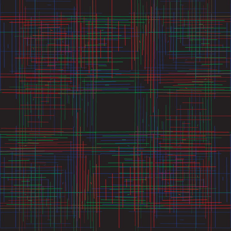 Still working in the RGB universe, a switch to straight lines... this techno tablecloth turns into a sort of plaid when scaled down and tiled— hence the title.