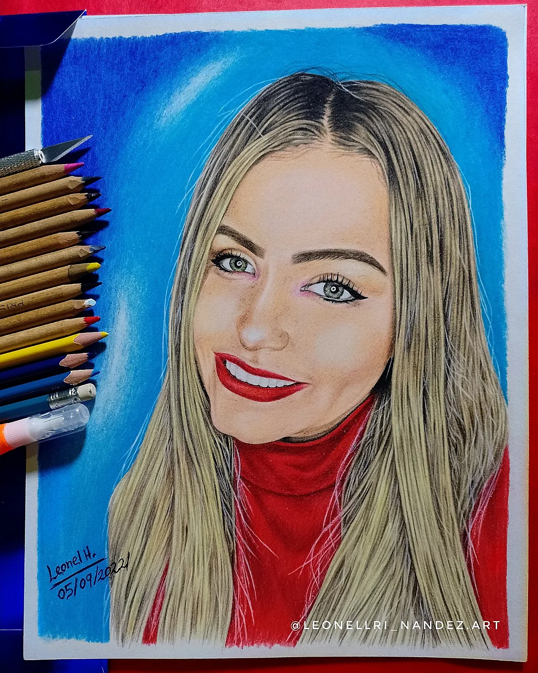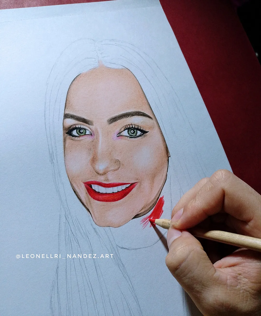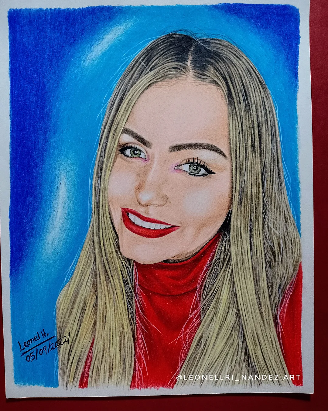 Esta vez utilicé lápices de colores prismacolor plasmando el rostro de está hermosa chica sobre papel opalina, la conocí a través de las redes sociales y ciertamente su belleza exterior así como su manera tan amena y amable de tratar conmigo y con los demás me inspiraron a querer estampar e inmortalizar su belleza en un retrato hecho a mano alzada, una de las partes más detalladas como pueden ver fue el cabello que me tomo algo de tiempo, pero logré lo que quería, utilizando así una cuchilla de presicion para dar efecto luminoso en algunas áreas de éste.