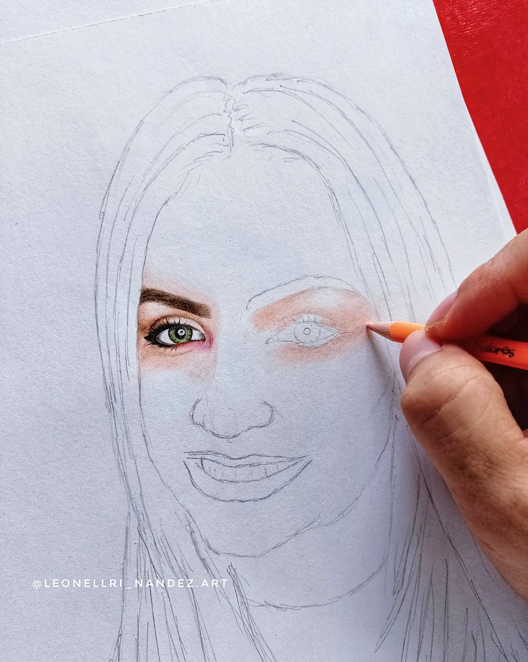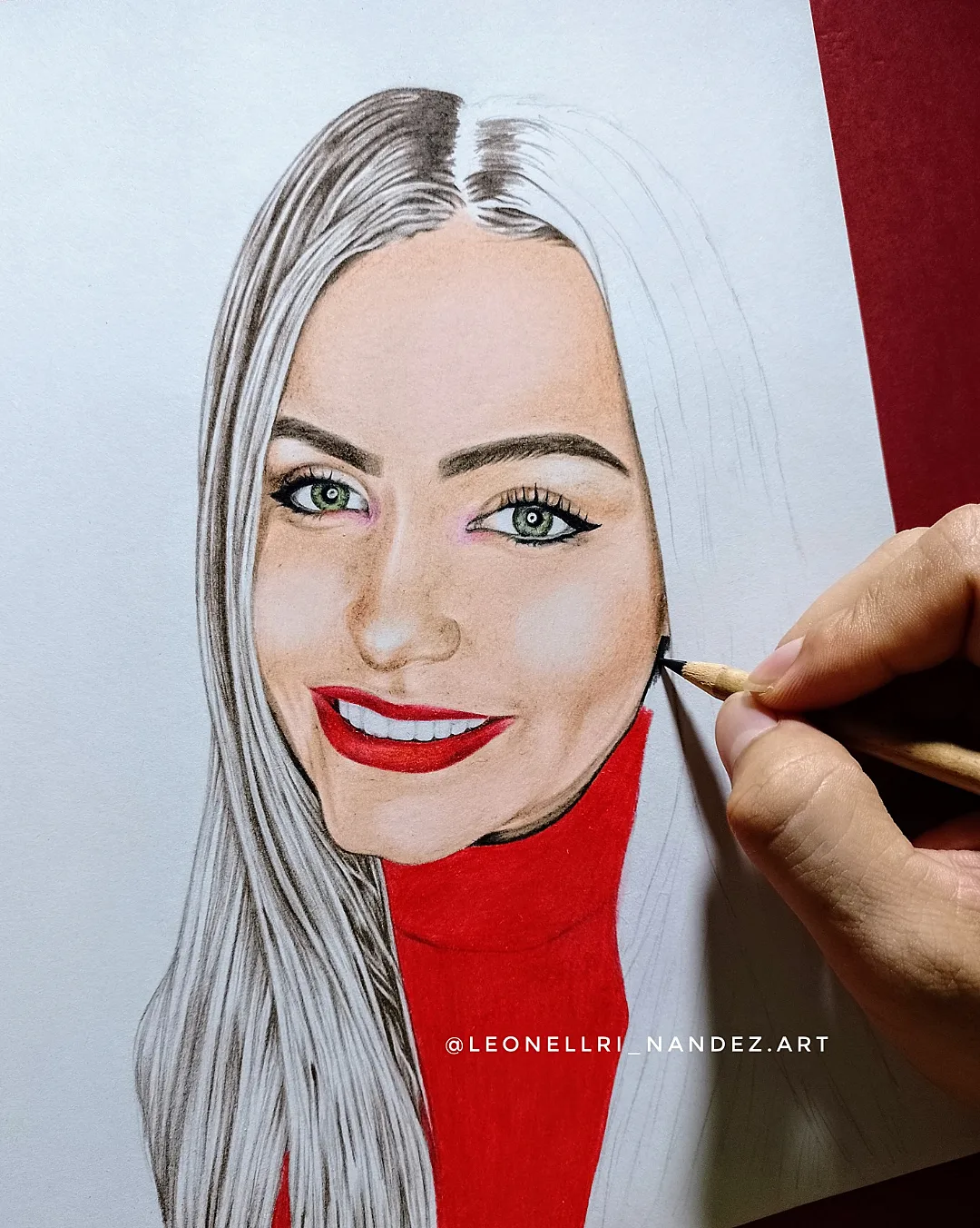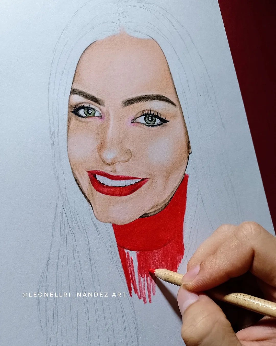 Esta vez utilicé lápices de colores prismacolor plasmando el rostro de está hermosa chica sobre papel opalina, la conocí a través de las redes sociales y ciertamente su belleza exterior así como su manera tan amena y amable de tratar conmigo y con los demás me inspiraron a querer estampar e inmortalizar su belleza en un retrato hecho a mano alzada, una de las partes más detalladas como pueden ver fue el cabello que me tomo algo de tiempo, pero logré lo que quería, utilizando así una cuchilla de presicion para dar efecto luminoso en algunas áreas de éste.