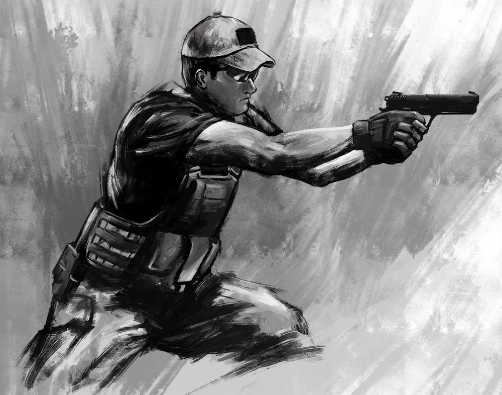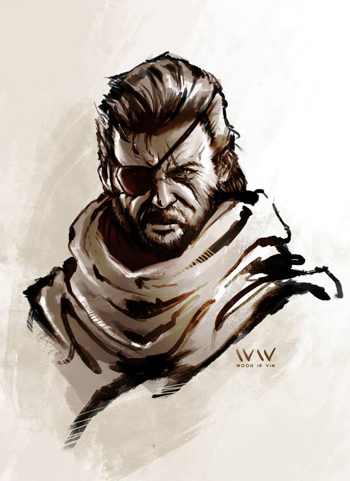 A monochromatic sketch of Venom Snake from Metal Gear Solid V.