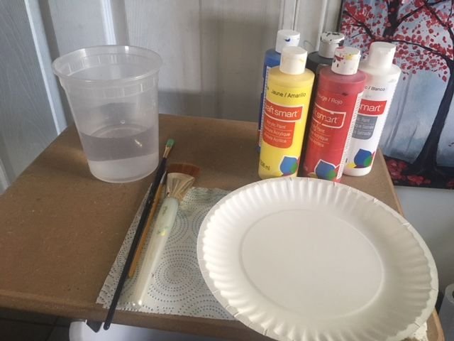 STEP 1: Gather your art supplies. Make sure to have a blank canvas, a cup of water, papertowels or napkins, art brushes of different sizes, paper plates, and acrylic paints. You just need the colors - blue, black, yellow, orange, brown, white.