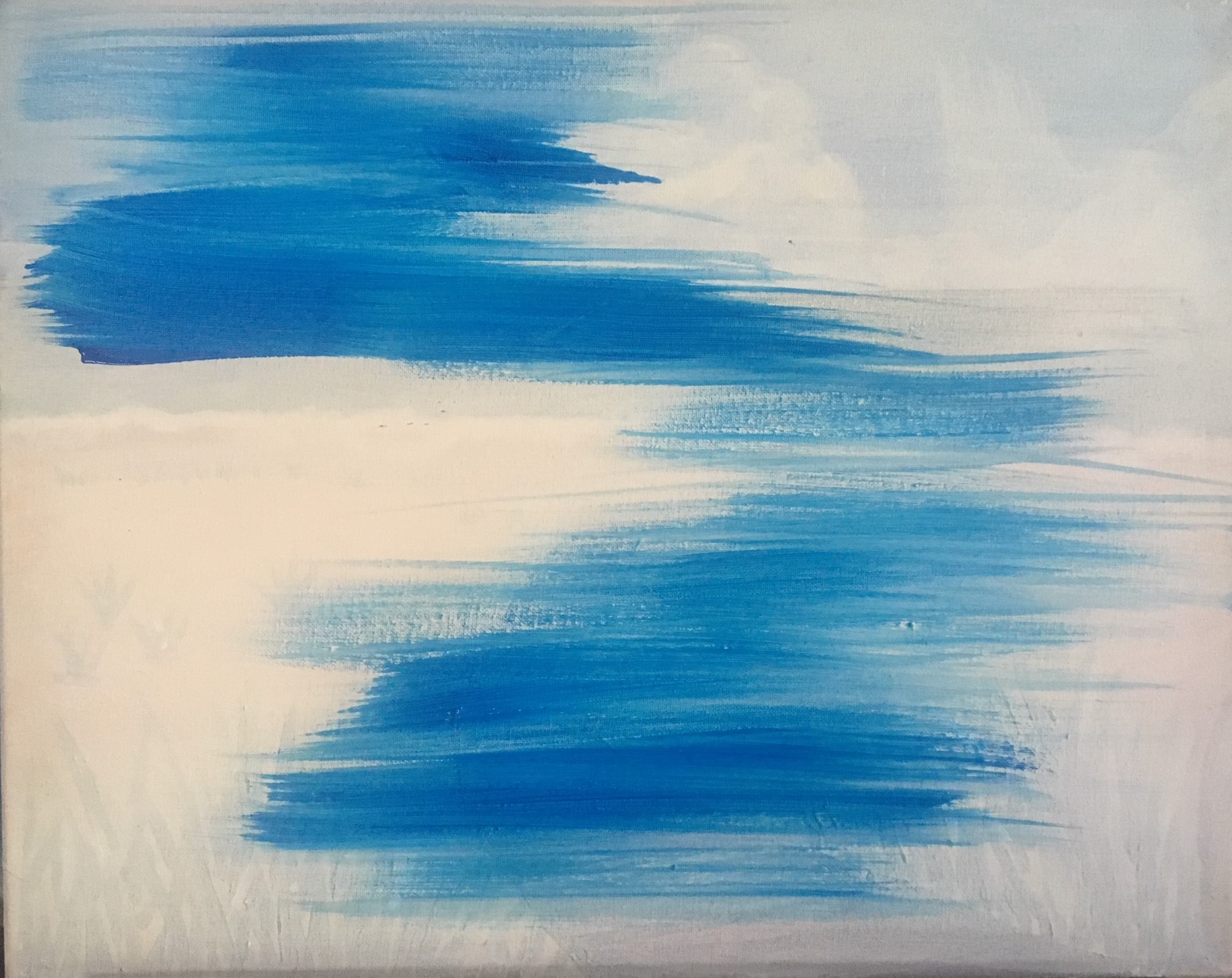 STEP 2: Use the big brush to paint your background. (OPTION: You may outline your pumpkin with brown paint & small brush first then paint the background around it to save drying time. On your canvas, create the background with a mix of streaky colors. Start with mostly blue, then add black on the extra spots - overlapping some of the blue paint to create a transition or an illusion of the night sky.