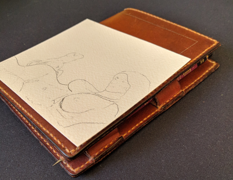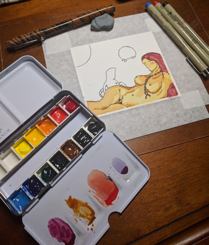 I used a pencil for the initial sketch, a safety fountain pen by Noodlers, and White Nights water colours.