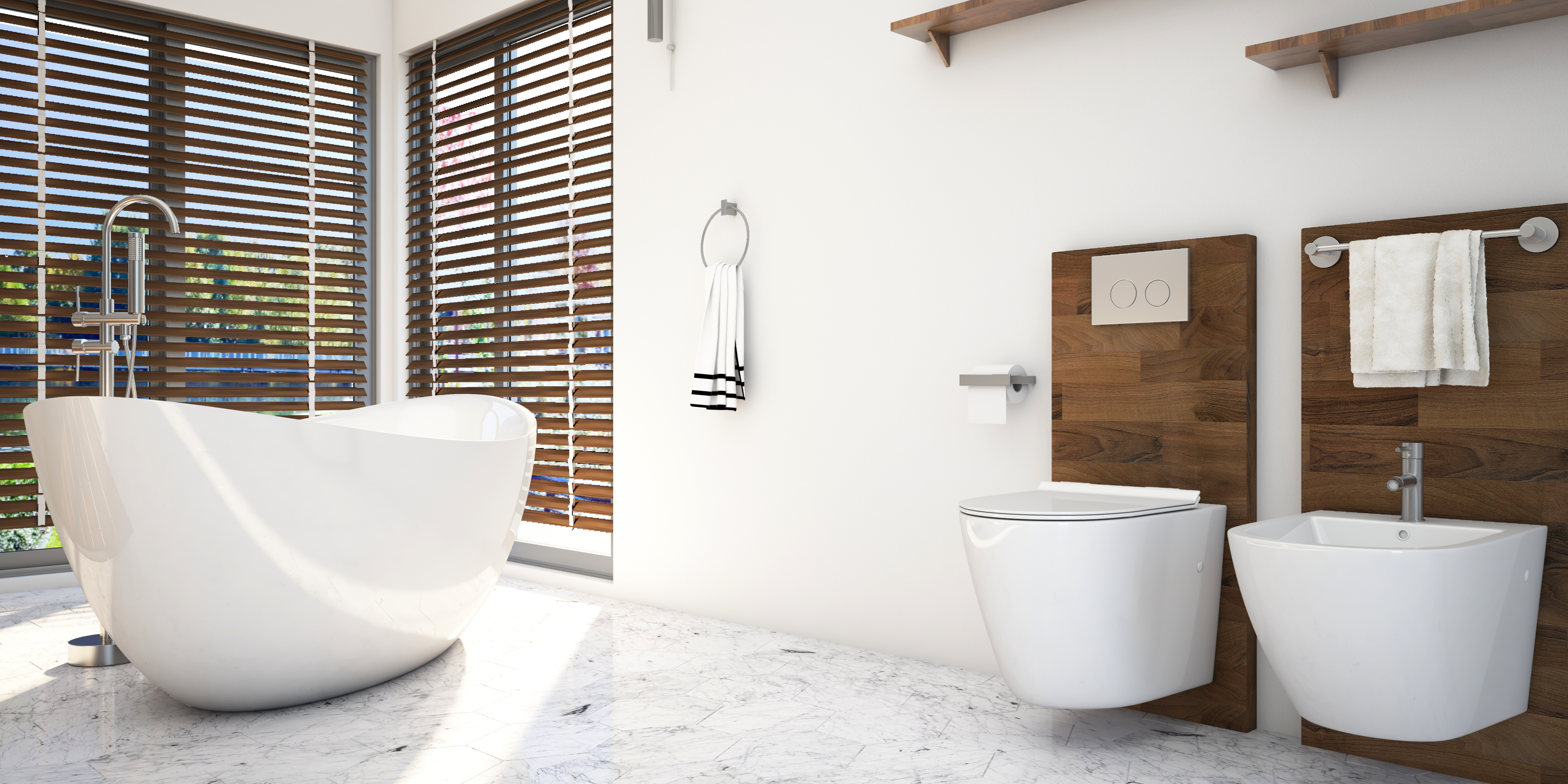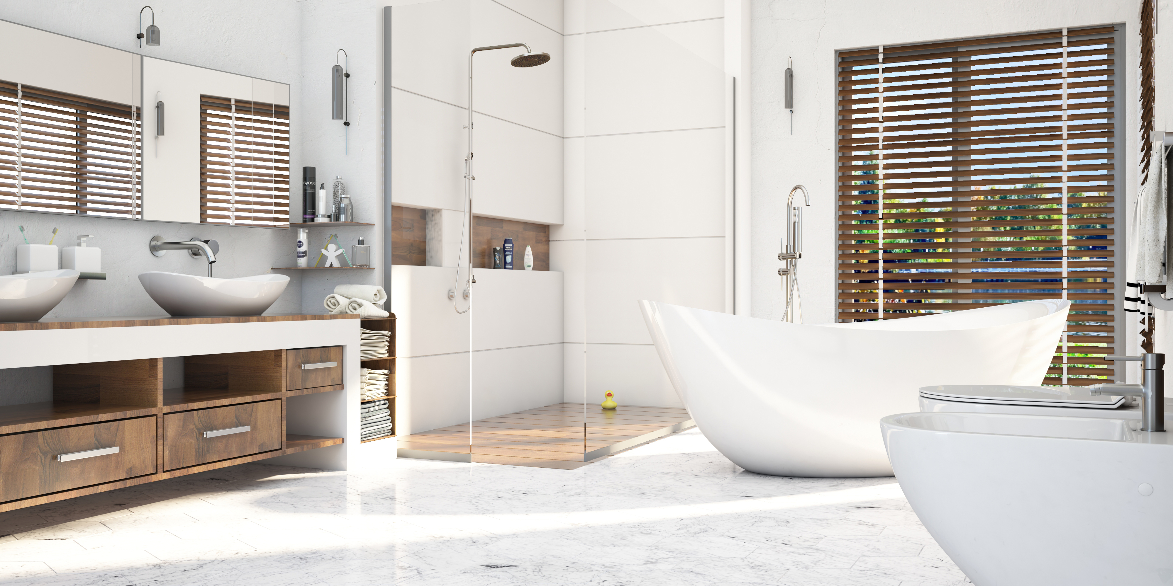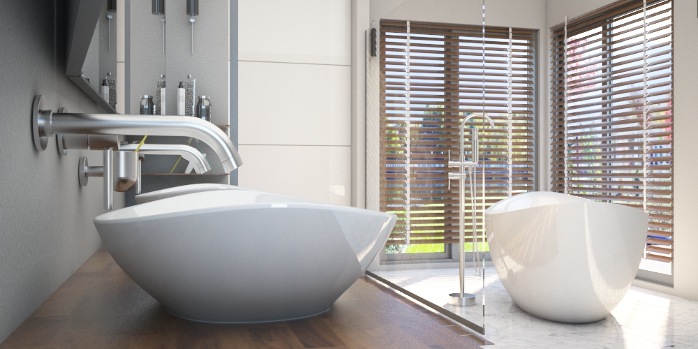 A large bathroom with a light color with elements of wood gently damaged walls, a shower and a centrally positioned bathtub. The project made in the Autodesk 3DS Max 2017 program for the project was also used by the Chaos Group Vray rendering program. The project took me 2 days. I focused on using daylight and reproducing the realism of glaze and metal parts. As you can see, I turned my attention to a very well-lit bathtub, which I placed near large corner windows. The main lights in the ceiling are like its organic part.