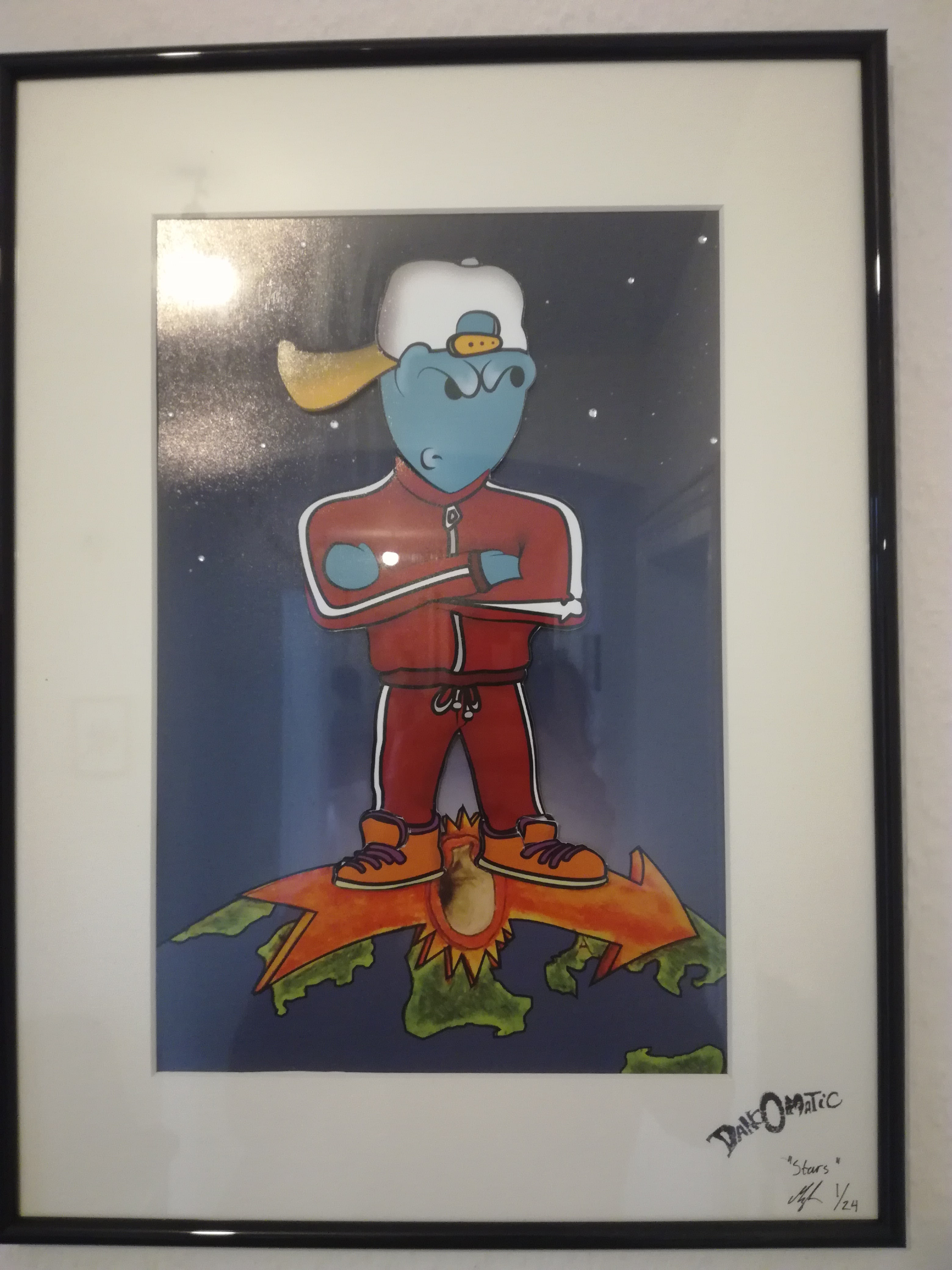 The character is invented by my friend Emil, who helped me design the artwork for danceOmatic 2nd. edit. I still don't know if he is an alien or a blue turtle without a shell... (Print on photo paper, with glued stars and double layered print)
