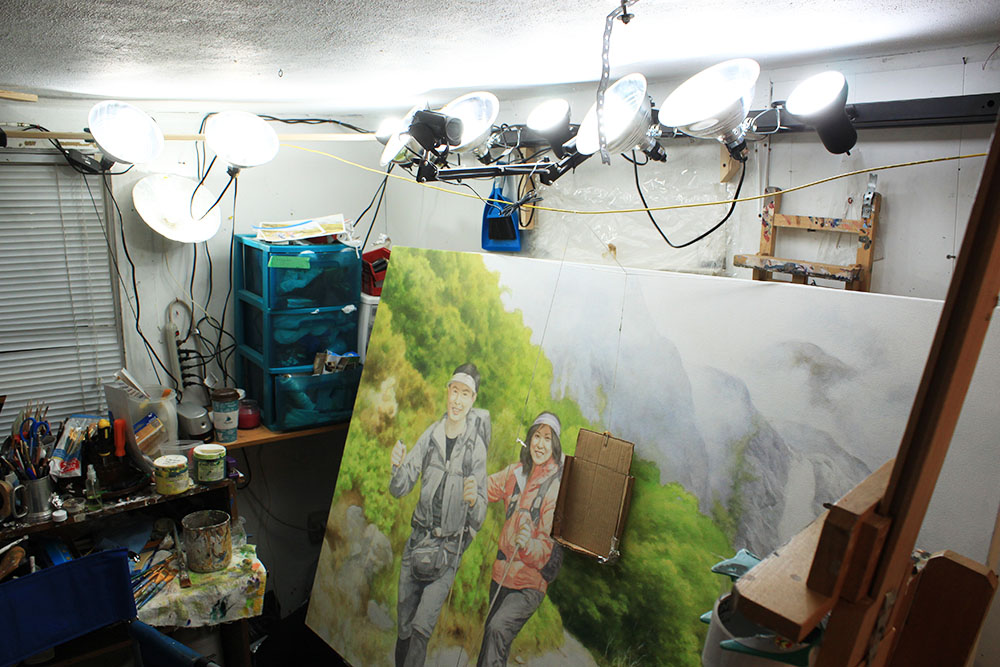 Here is a shot of my messy, well-used studio with the lights aimed at the ceiling. The reflected light works great to illuminate even a large painting. While I'm working there are virtually no shadows from my hands and arms to interfere with my painting.