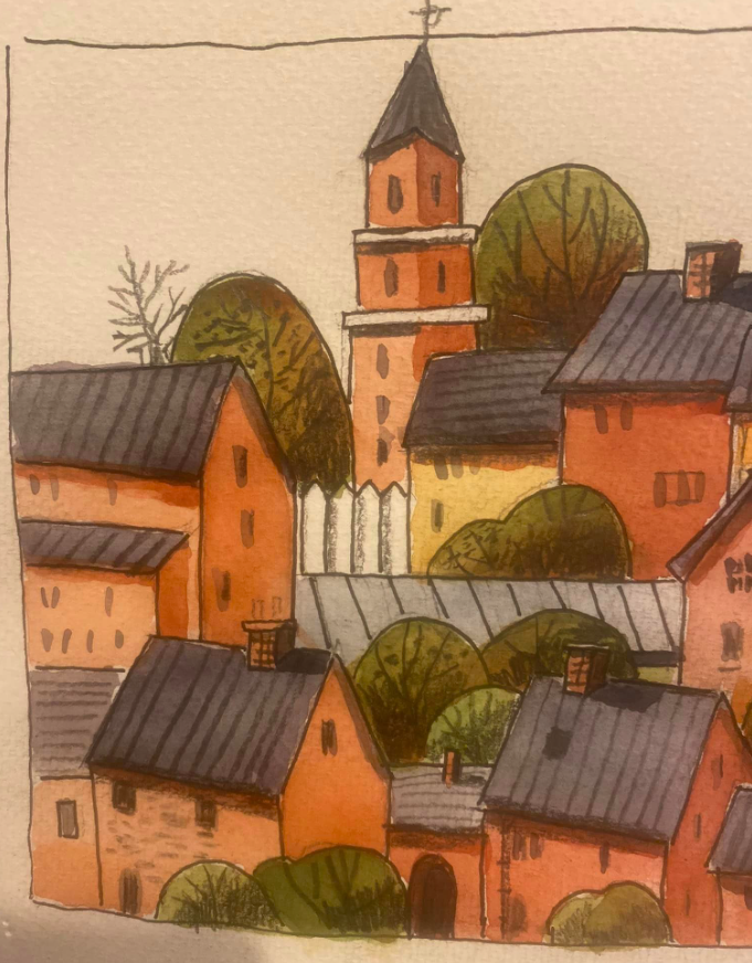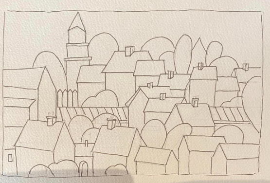 Traditional country scenes have been popular in my class in the past, so we just stick with that. Cityscapes are easier because it mostly involves 90 degree angles, but I find that quaint small villages have much greater opportunity. In the above picture you can see that a student has already completed the pencil and felt-tip pen outline. If you look closely you can see where there were some erasures and that is fine! It is all part of the process.