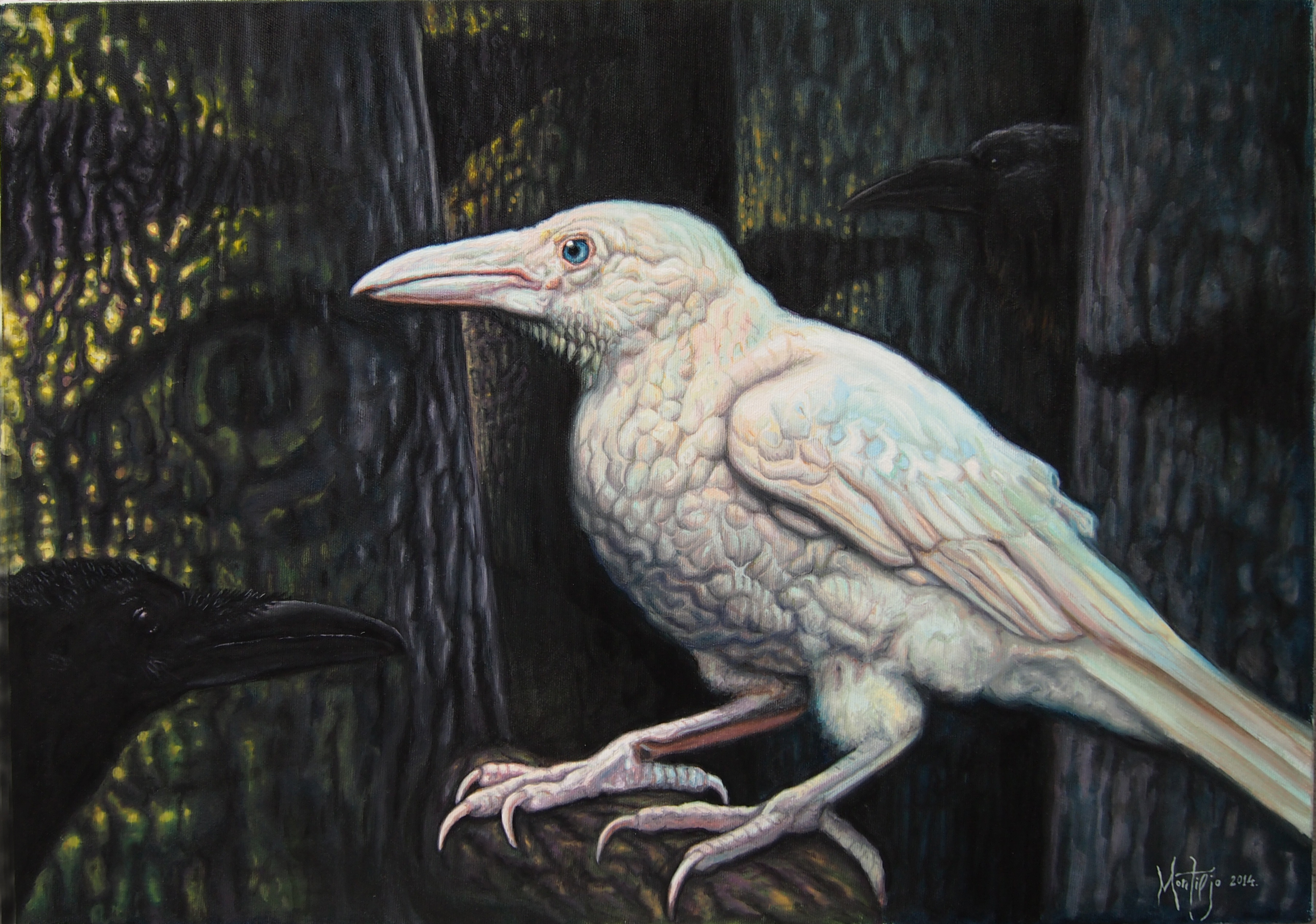 The white raven is very rare in nature. Because of its diversity, black ravens do not accept him in community. That's why he was interesting to me as a motive for painting. He is always visible while the black raven can be shrouded in the shadow. The white raven in nature, for me, symbolizes a man who is an artist in the society of mediocrity. His white feathers are artistic sincerity, brazenness in the world. He shares his intimacy with everyone, and those malicious ones can get him wrong. He is marked by his whiteness and is a light target. In this discomfort, his physical freedom is endangered, but this is the price he pays to cultivate the freedom of his spirit.