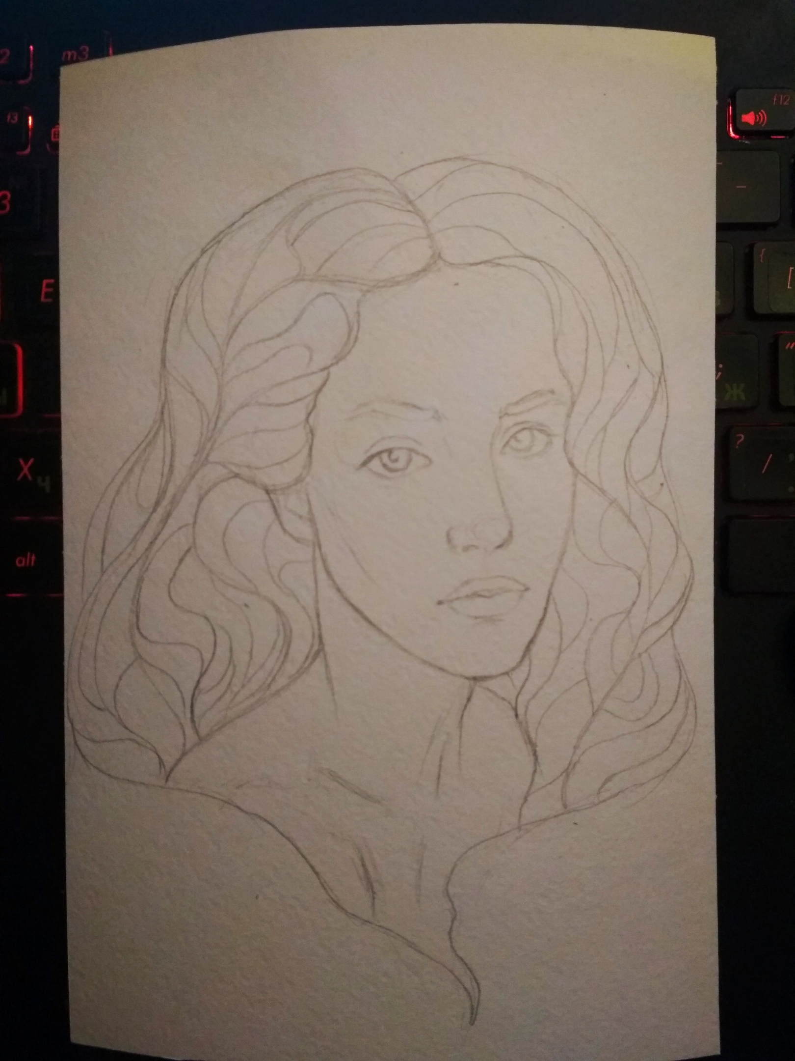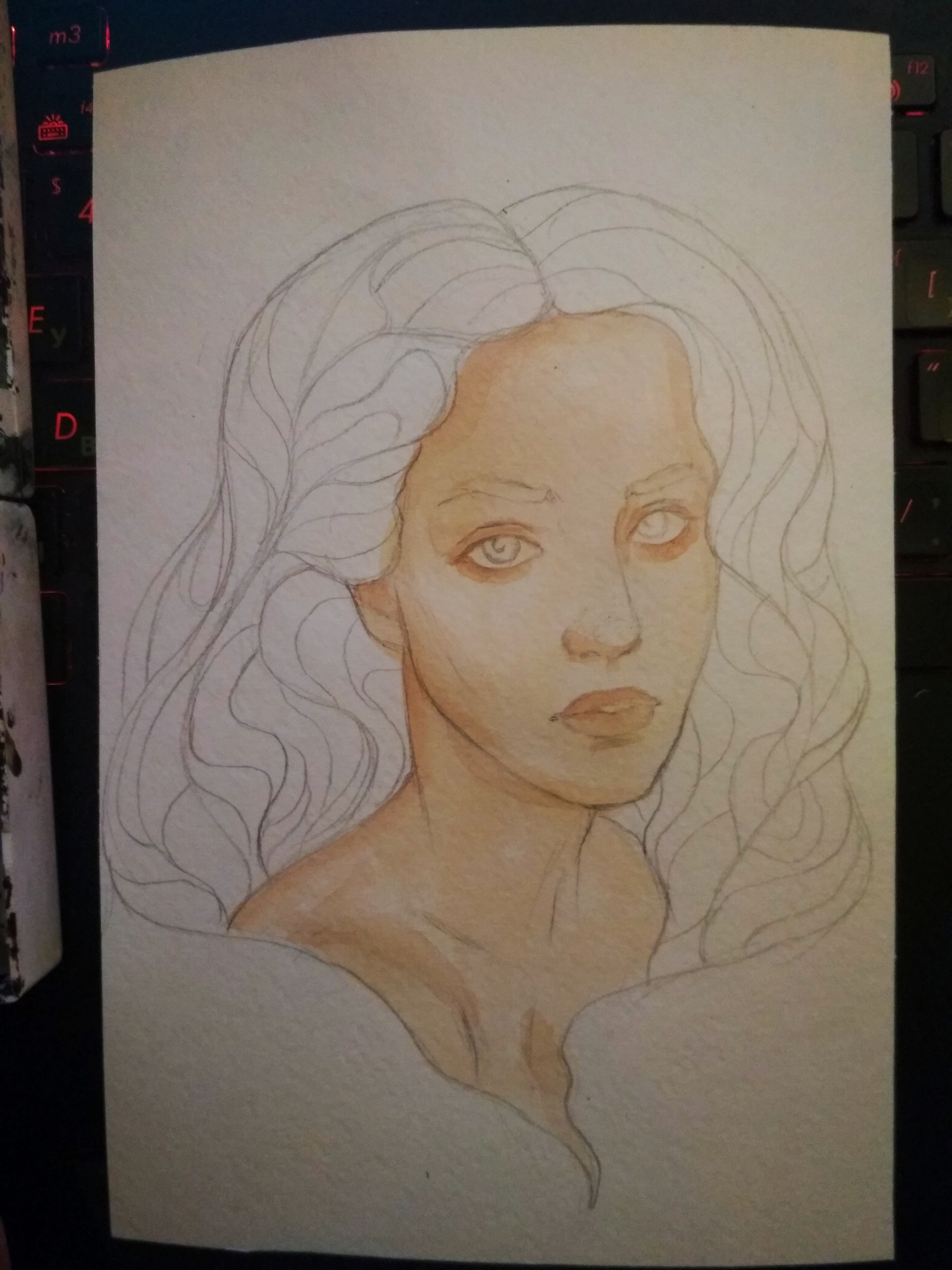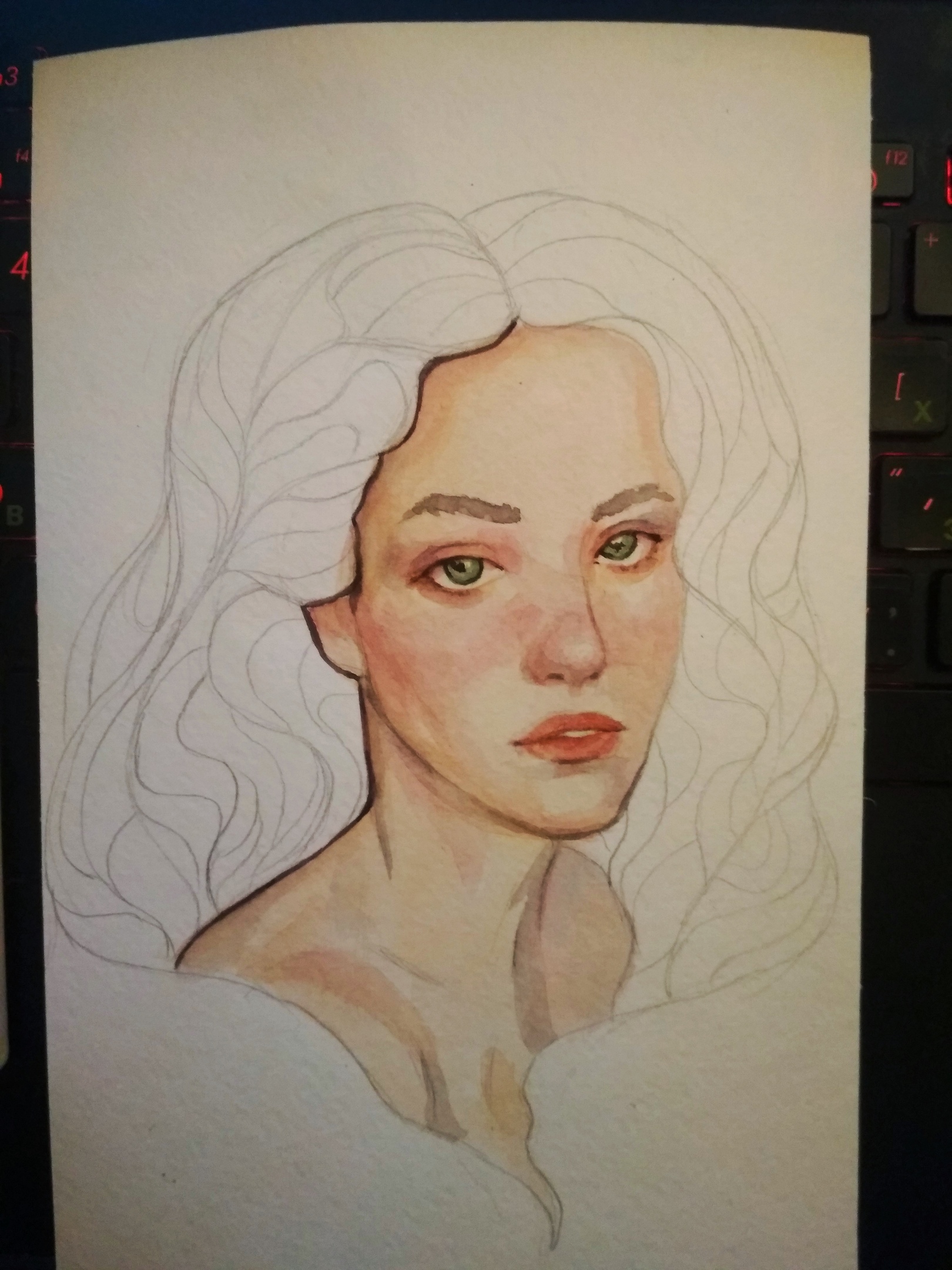 It's an interesting style of painting. I like how you painted her hair. It looks like it was divided in many geometrical shapes and each shape was painted with slightly different tone - very nice.