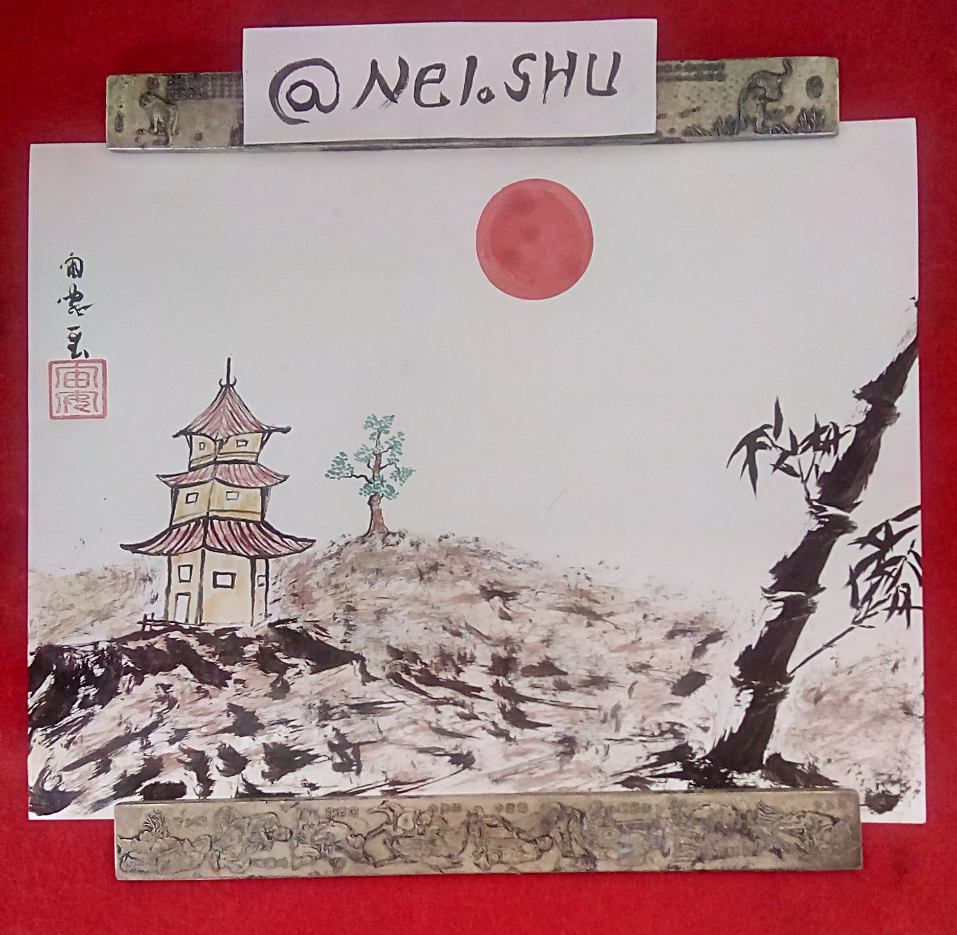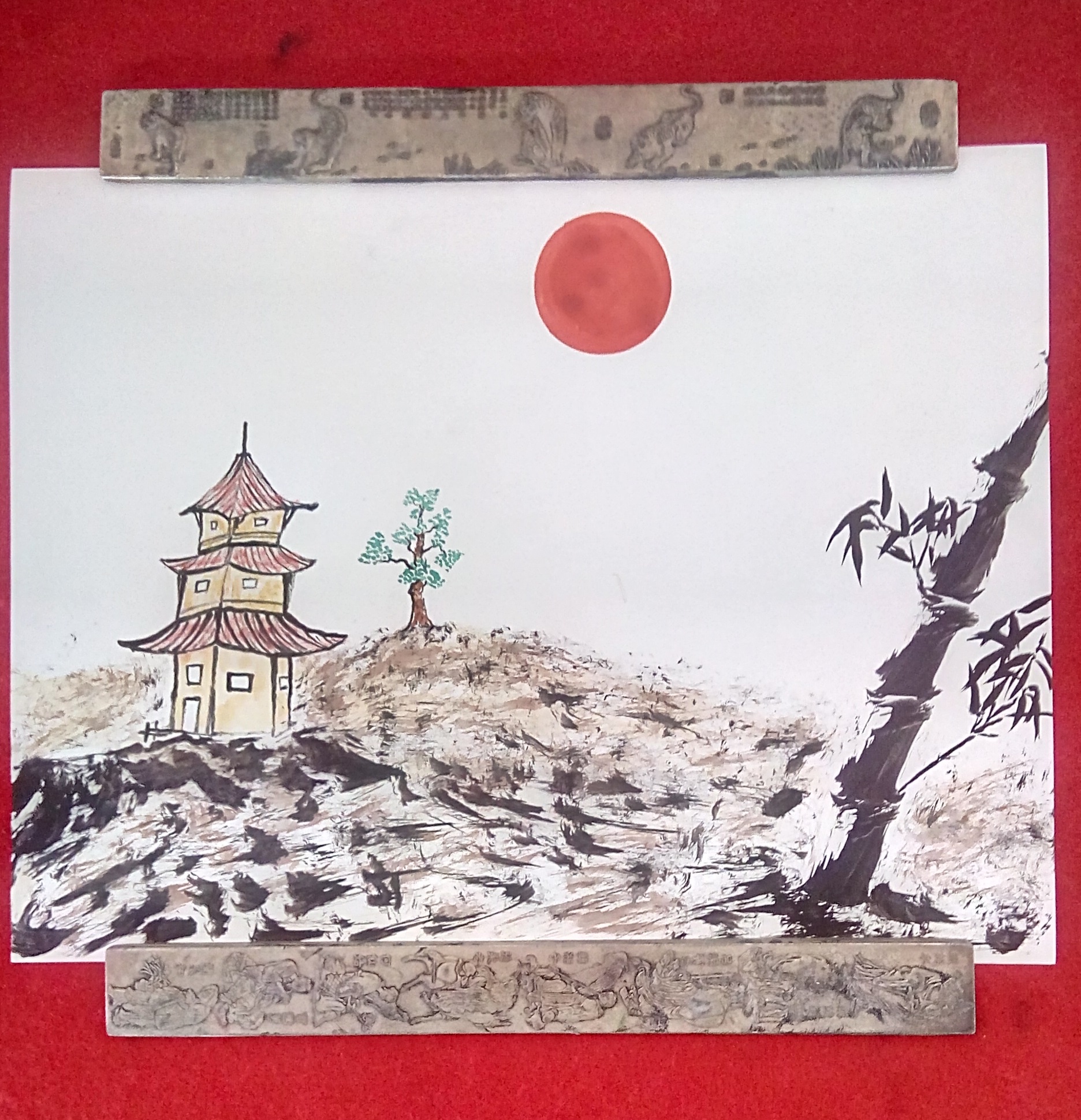 Después de algunos problemas técnicos, aquí estoy de nuevo, obsequiándoles comos siempre una Pintura China que los conecte con su esencia y que les brinde paz. En esta oportunidad una Pagoda acompañada por un sol rojo.