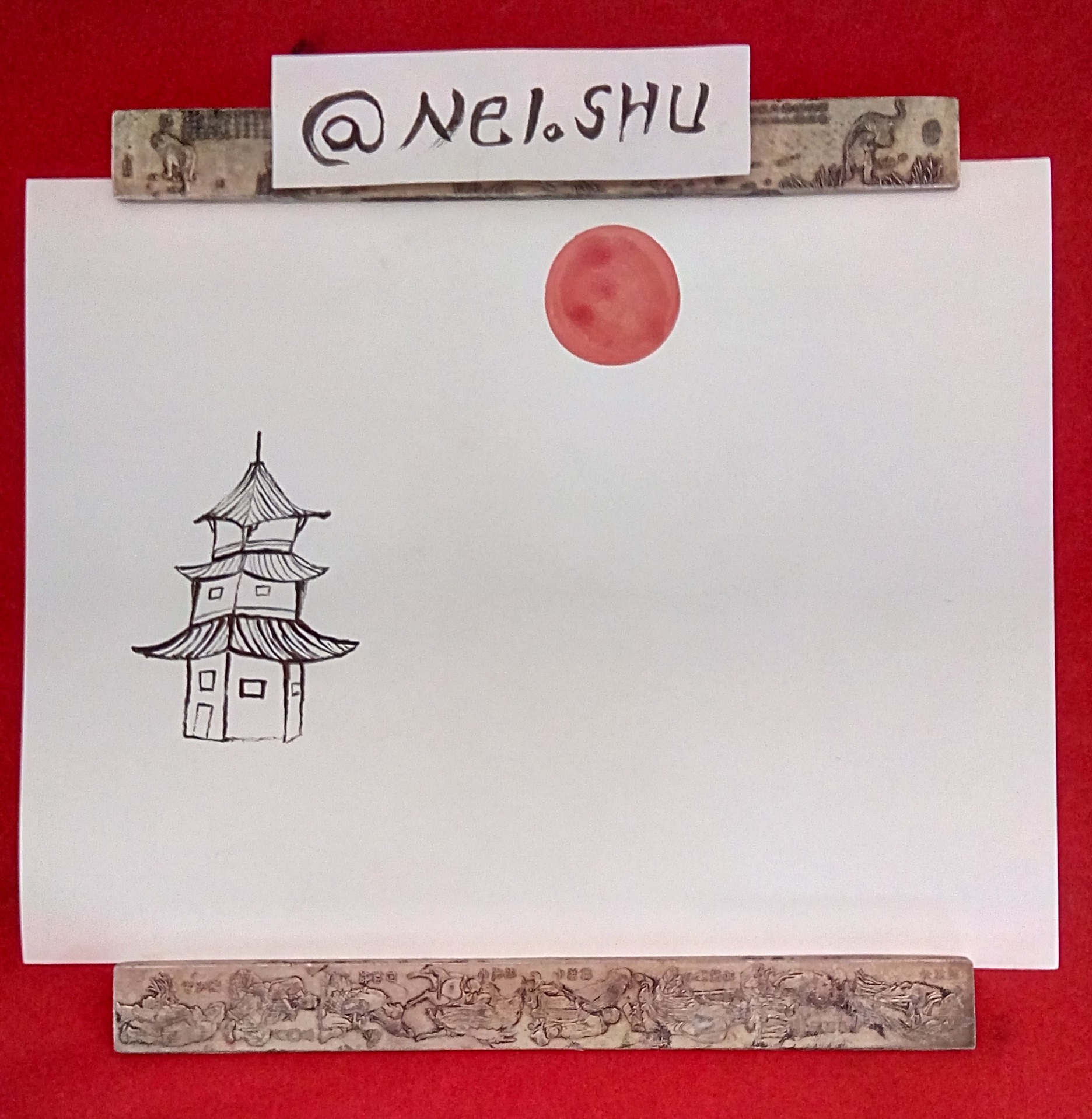 Luego ubiqué la pagoda. Elaborada con tinta china negra y un pincel bastante delgado.