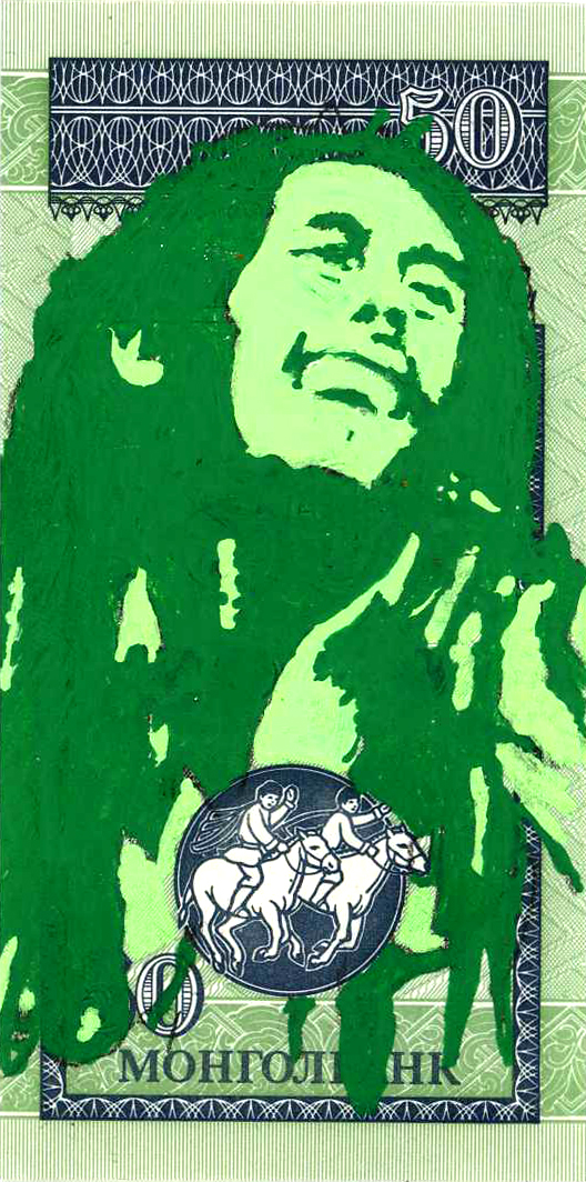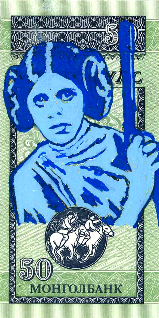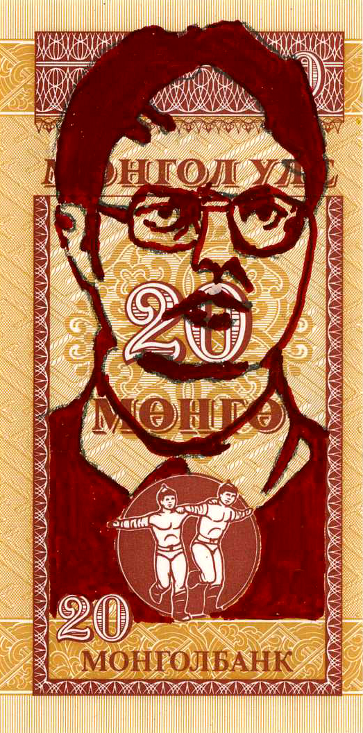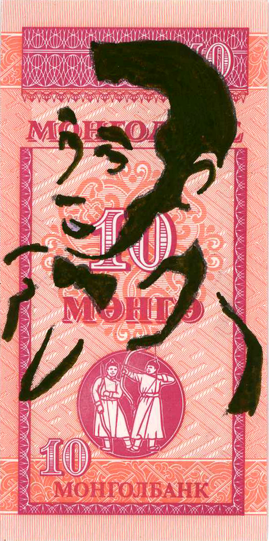 This is my latest art on banknotes... The Four Seasons is a set of 4 notes... Like winter, spring, summer, and fall... The bills are from Mongolia, circa 1993, and too small to really do a masterwork upon... So pop art portraits to a seasonal theme... yay!