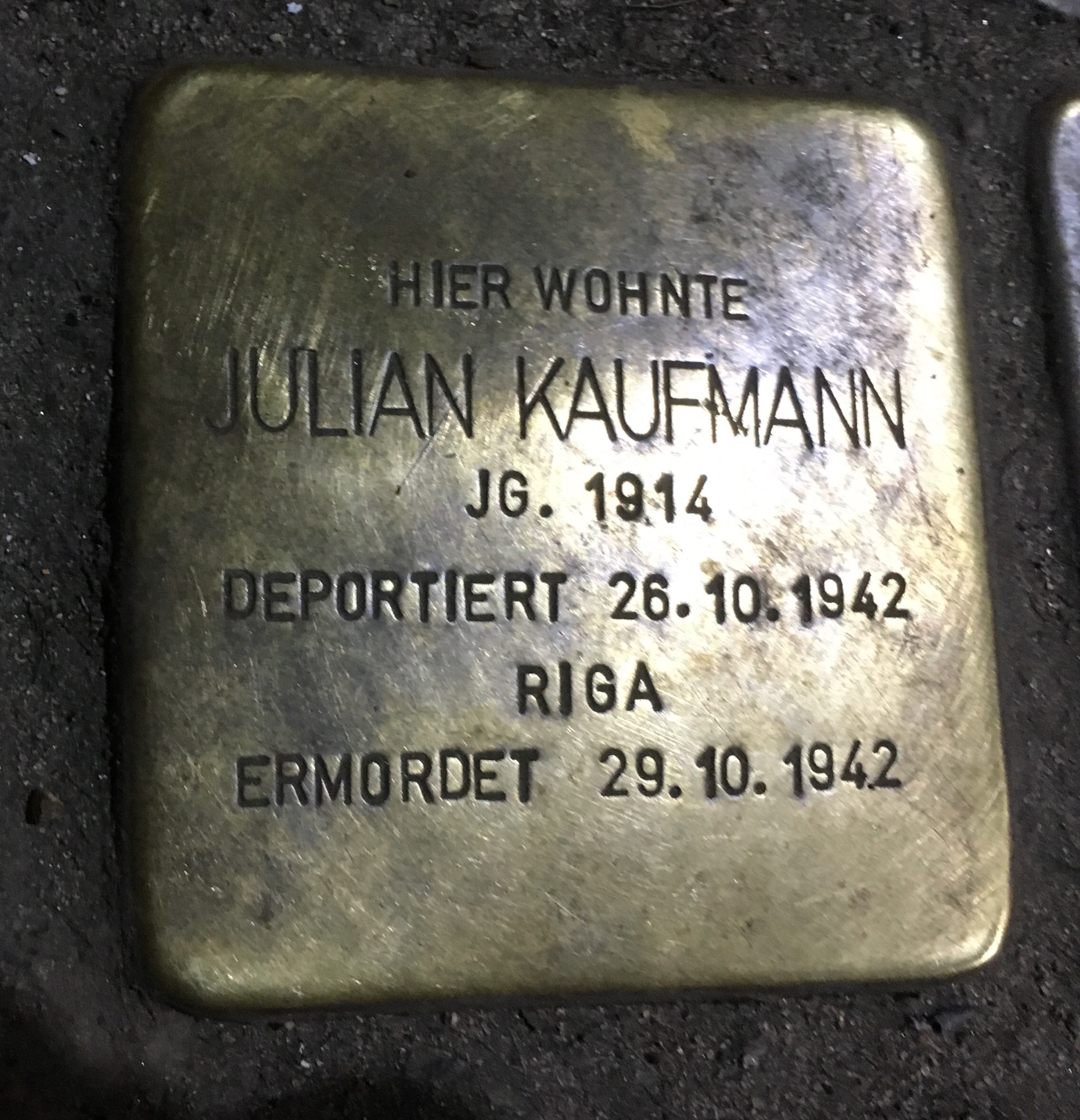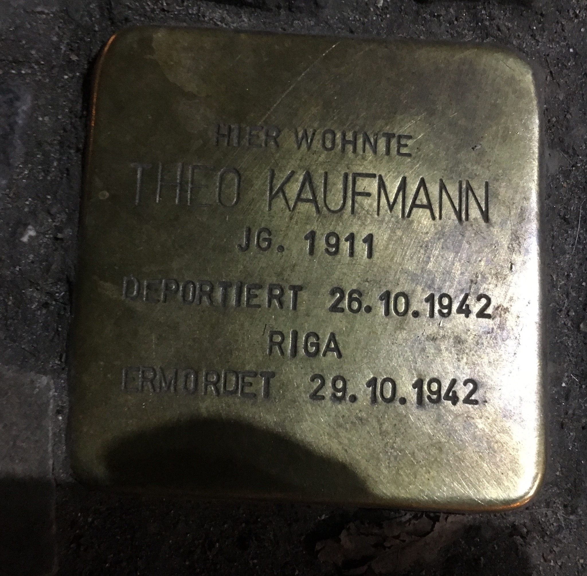 May we never forget the Kaufmann family: Theo, Kurt, Helene, Julian, Johanna and Gittel, taken from this inauspicious spot in Berlin 26.10.1942, Ermordet 29.10.1942.