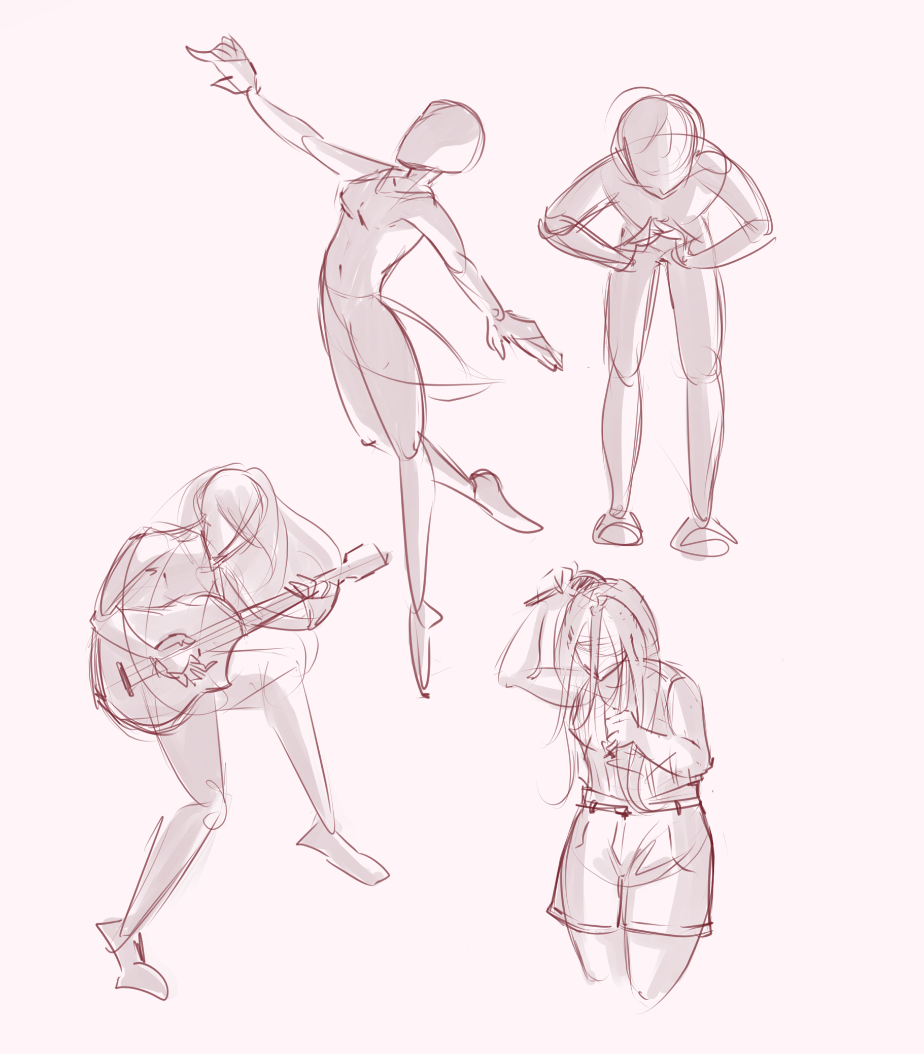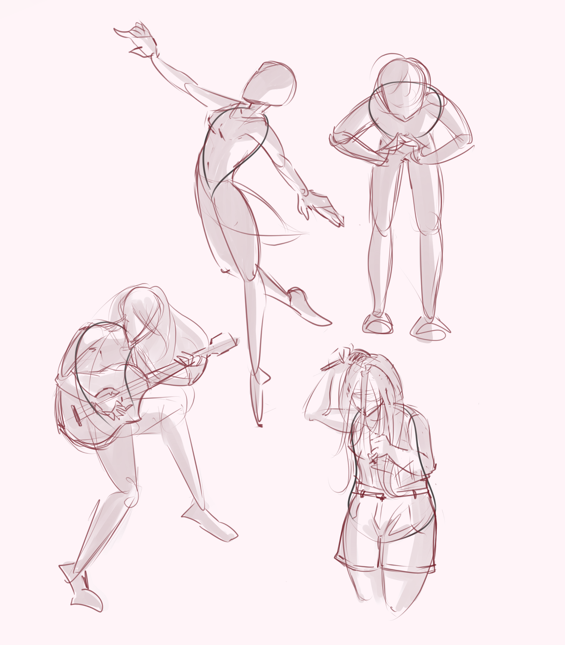 Hello! I'm gonna show you some sketches today, and a fun thing I like to do to practice drawing poses: I draw a random shape, and then try to turn it into a person. I also added some shadows to these. It can be hard at first but it really helps make more dynamic drawings.