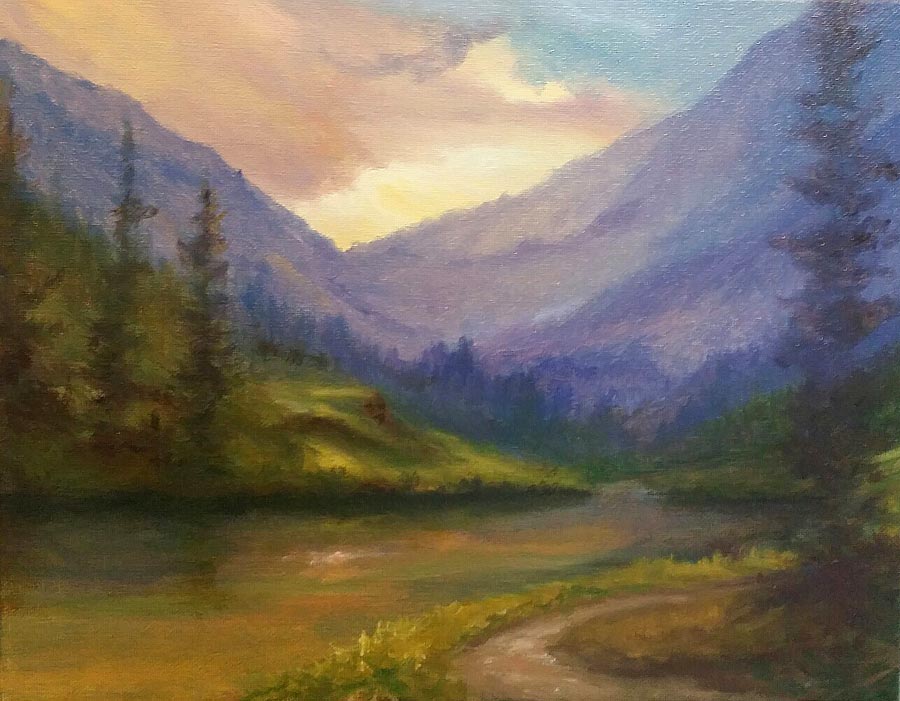 Today I've been working on intensifying the colors of the purple mountain painting that I've had on the easel this week. My goal with this piece is to make the colors feel balanced but intensely bright and eventually a glowing haze in the air in the valley in the distance.