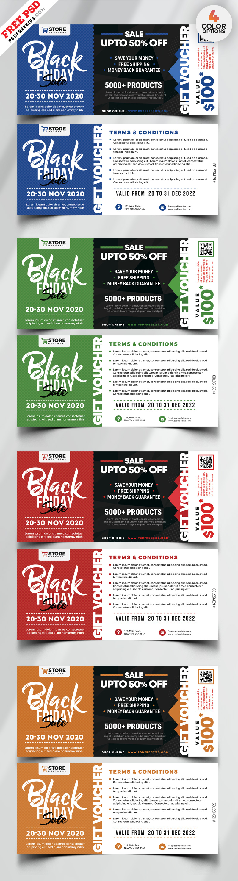 Download Free Black Friday Sale Voucher Design PSD. This Black Friday Sale Voucher Design PSD to promote Black Friday Sale or any kinds of business use like Shopping Mall, Electronic Store, Fashion Store etc. This Black Friday Sale Voucher Design PSD is fully editable and customizable in Adobe Photoshop. Freebie is available in 4 color options. This free template download contains 9 x 4 in, 300 dpi print-ready CMYK 8 PSD files (4 Front and 4 Back side).
