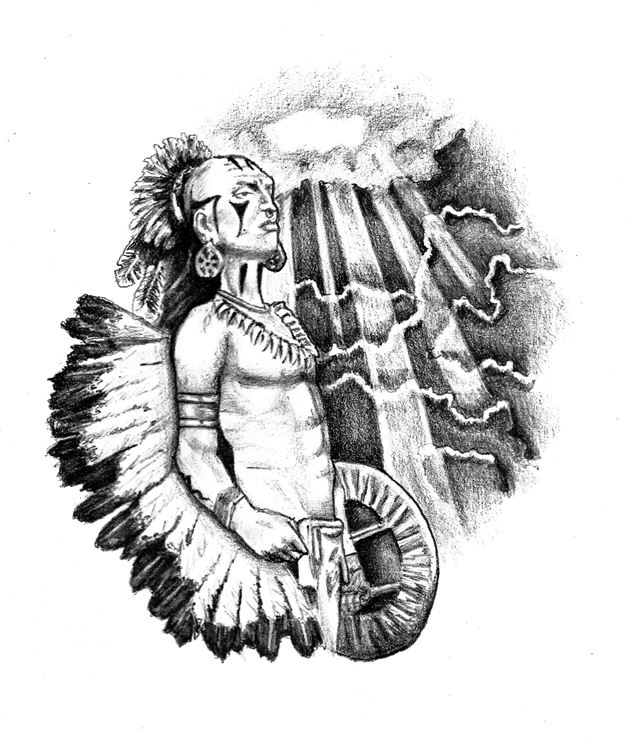 My third and final Native American tattoo design I made (check out the first and second. Since I love doing realism and haven’t done a Native American design in this style yet, I chose to draw a realistic warrior. I wanted to incorporate some nature elements as the background of this design. Since the sun is an important part of South American civilizations in general, I wanted to include sunbeams shining through the clouds. From all the three designs I made, this is probably my favorite.