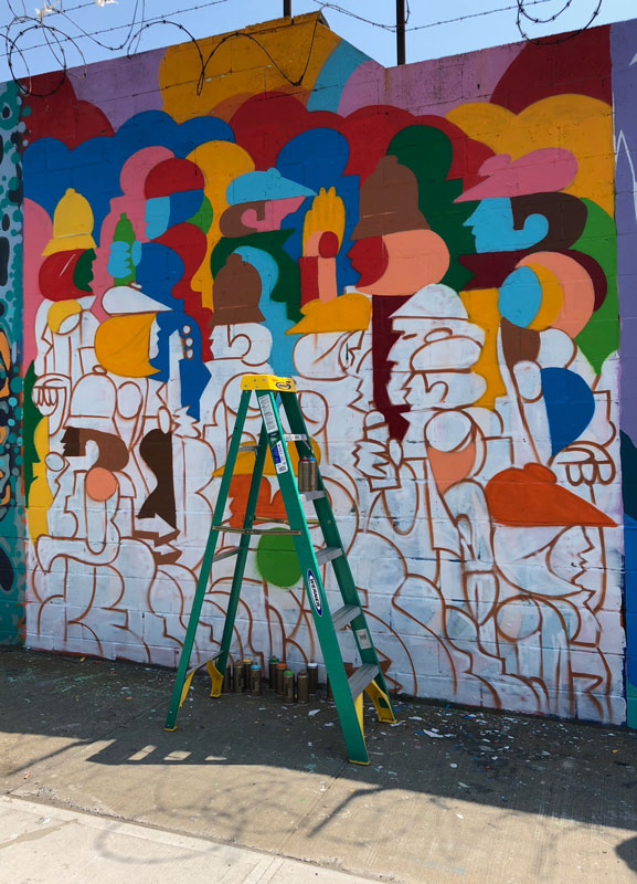 Step 5 - Continue to work down from the top and lay the color into place. Im working with primary and secondary colors again this year. It continues to inspire me and help the piece really pop once the final outline is applied. This is the most labor intensive aspect of the mural.