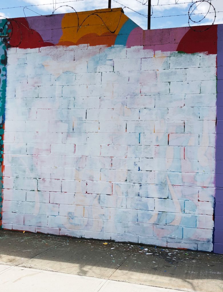 Step 1 - Yup, everyone has to buff the previous year's mural. In a lot of cases, it is usually your own. I love working in the same spot and how the other amazing artists on the same strip compliment each others work so well. This year, I hit the old mural with a roll out of primer and the intention of adding to the previous background clouds up top. I had to also recompose the barbed wire too...funny and not funny!