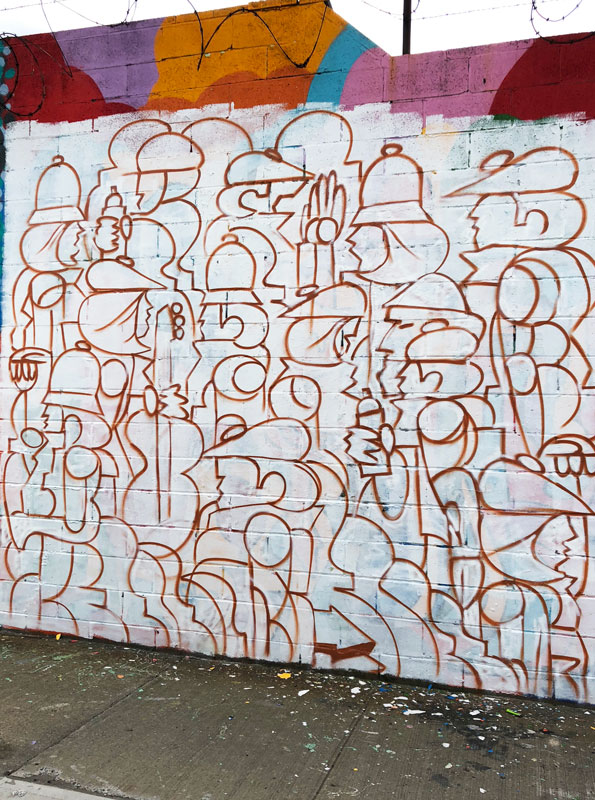 Step 3 - The complete the sketch. I need to do this for scale, composition and an overall sense of how the fragmented pieces come together. In this case, this mural is a celebration of NYC B-Boy and B-Girl characters, hip hop and graffiti culture. I have been inspired by this art movement since 1982 and counting! I pay homage to what has inspired me with the intention of inspiring you back.