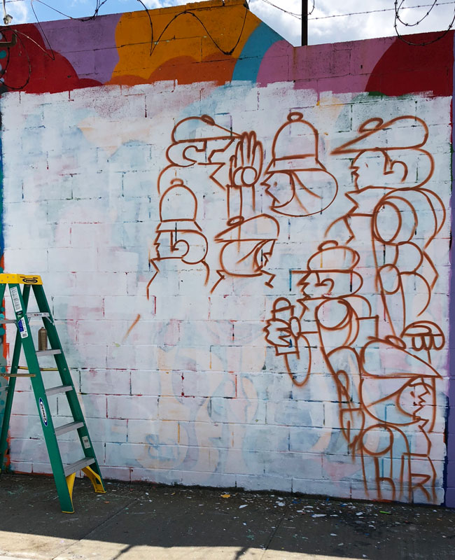 Step 2 - I like to first lay down a loose sketch of lines with a solid color. My murals are usually intuitive and unplanned in terms of subject matter. I may make a sketch on paper weeks before just to please my "what if ego-self" but I never follow it. I love making the process immediate, and a puzzle of figuring it out as I go.