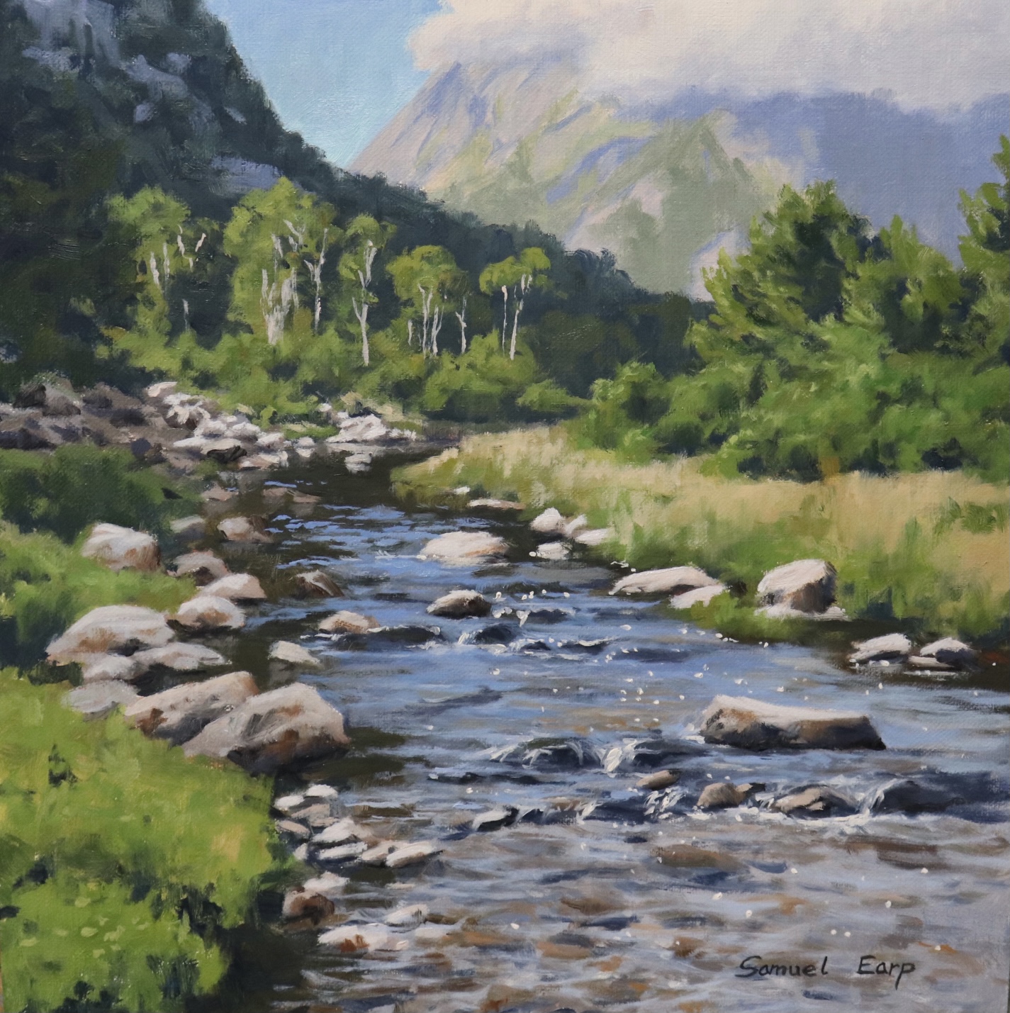 Mountain Stream, Fiordland, 12” x 12”, oil on linen panel.