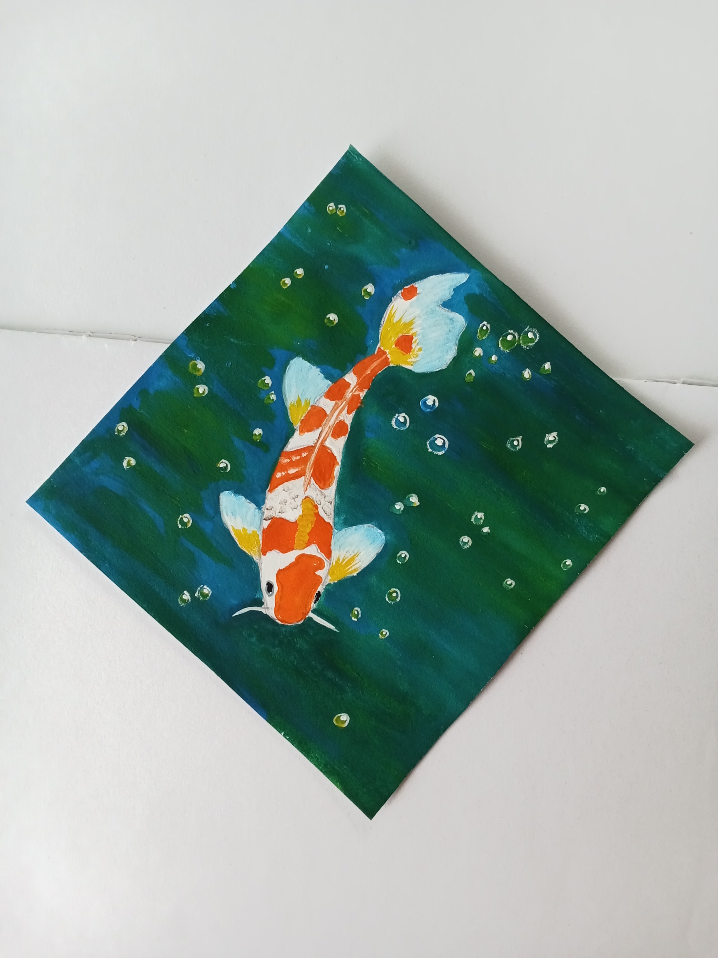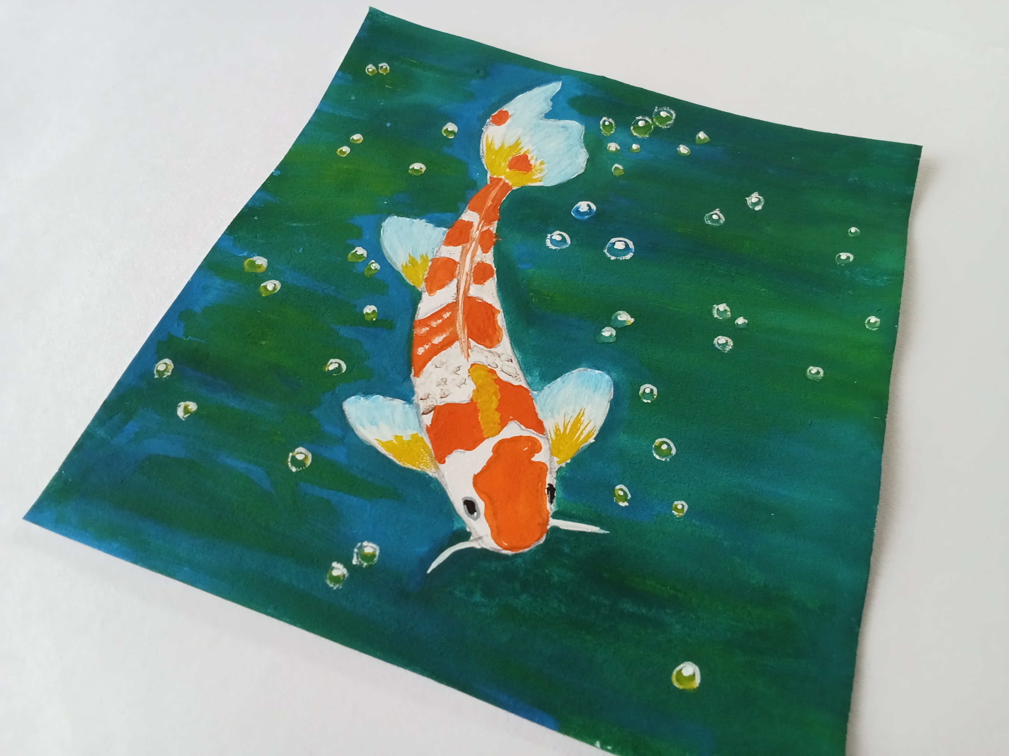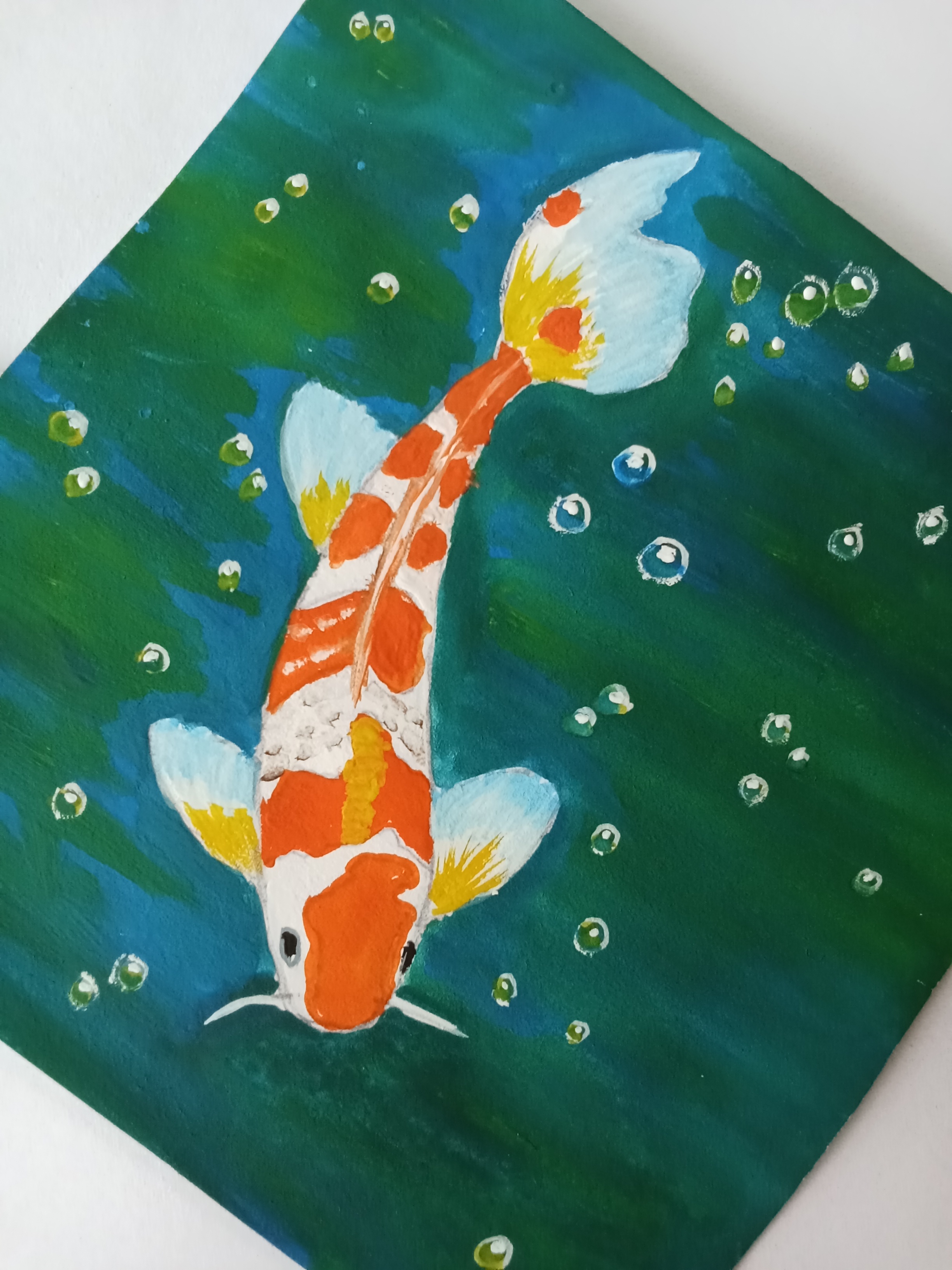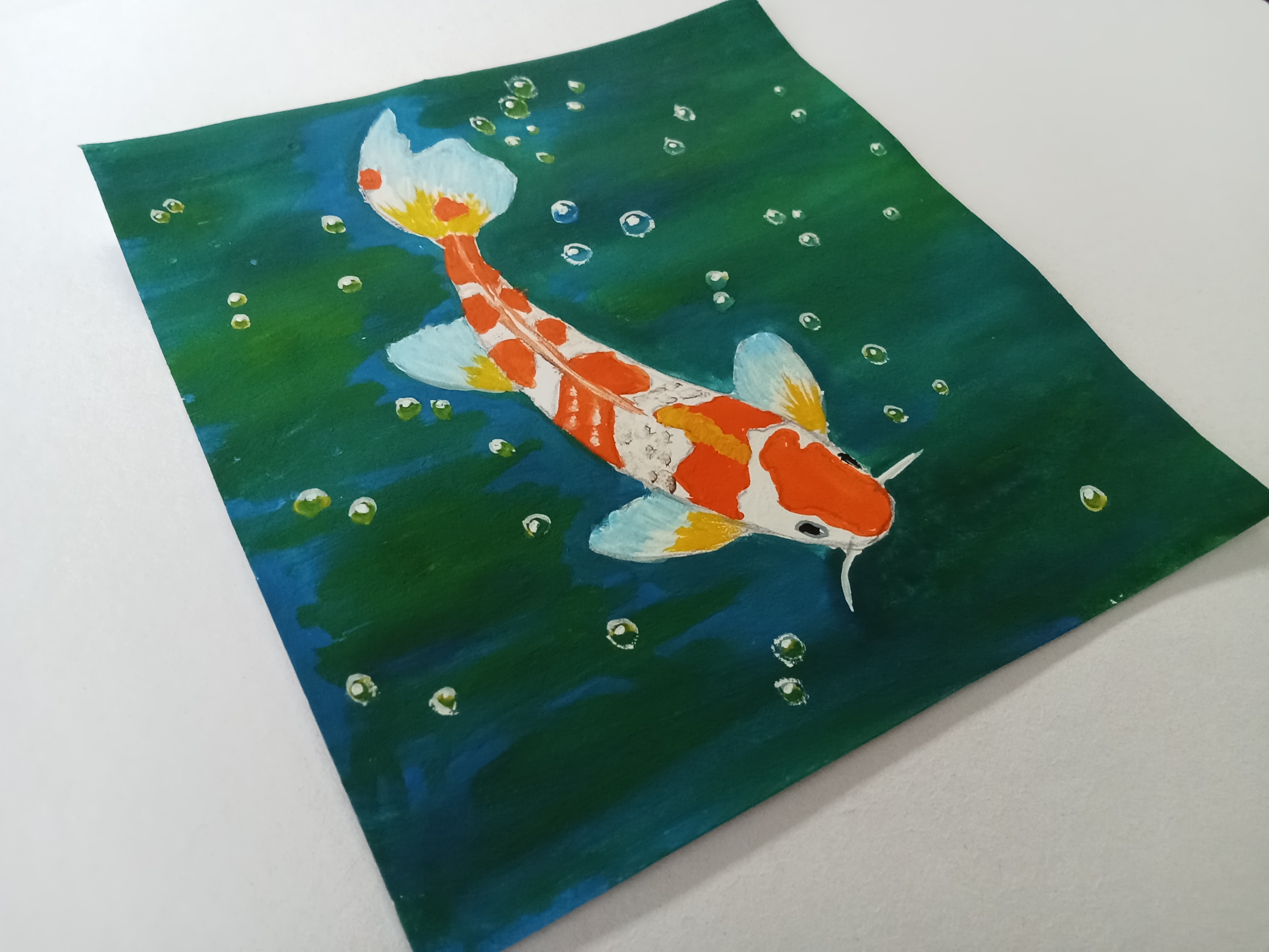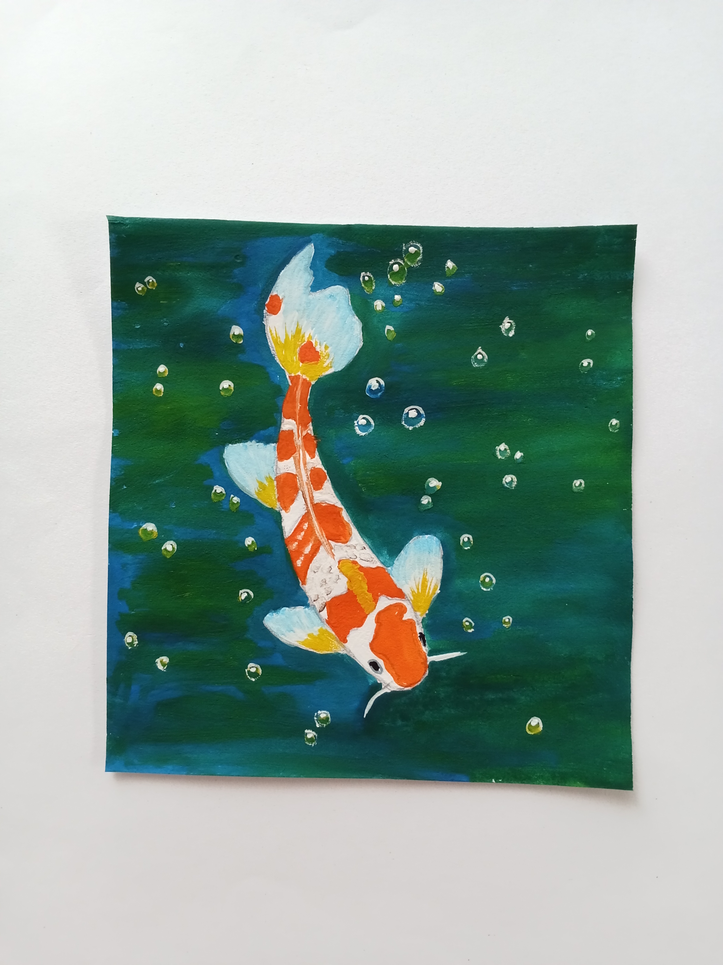 Today, I draw a fish. It is an orange and white fish and I also draw water bubbles. I paint this picture with watercolor and I think it is beautiful..