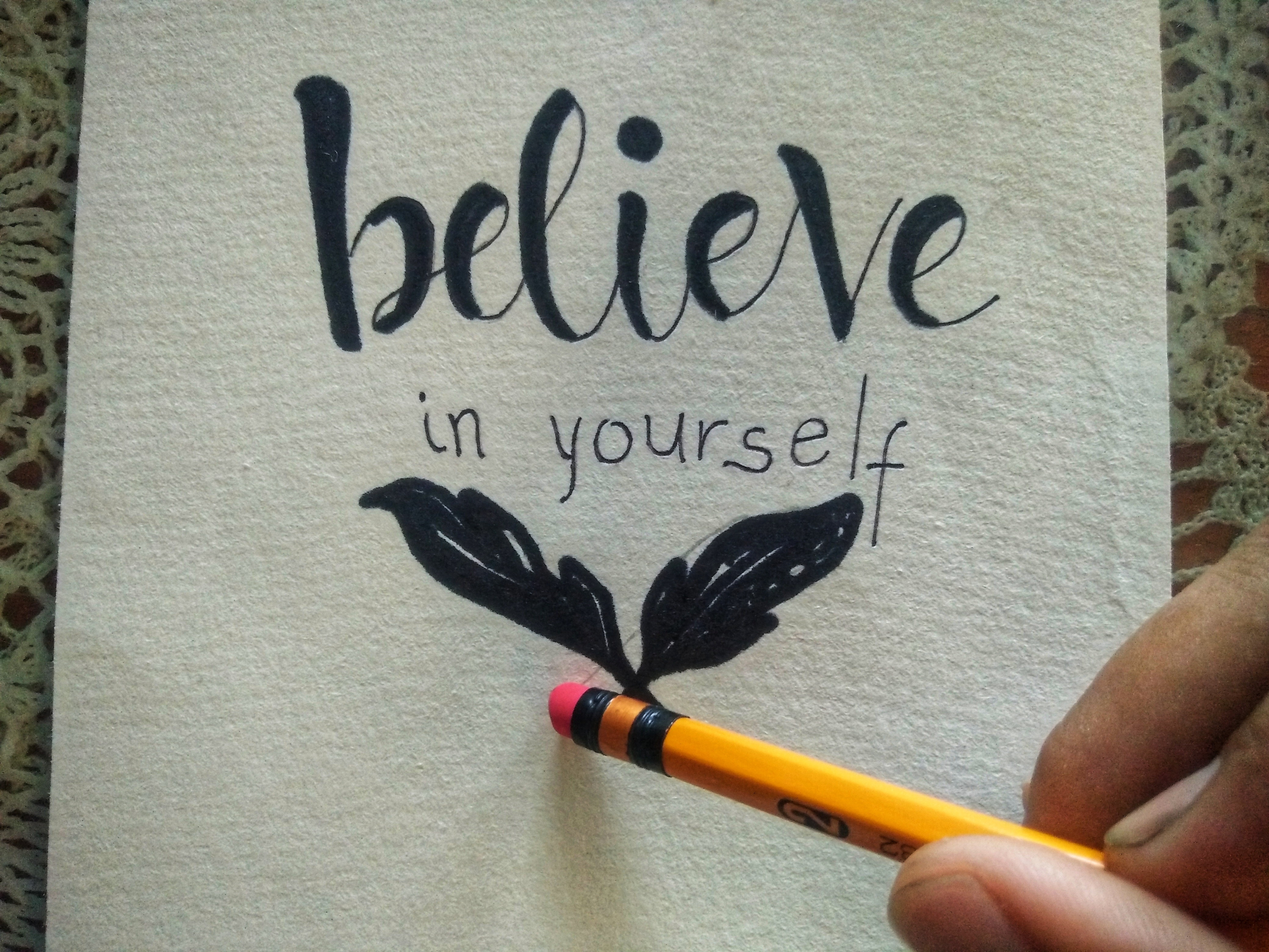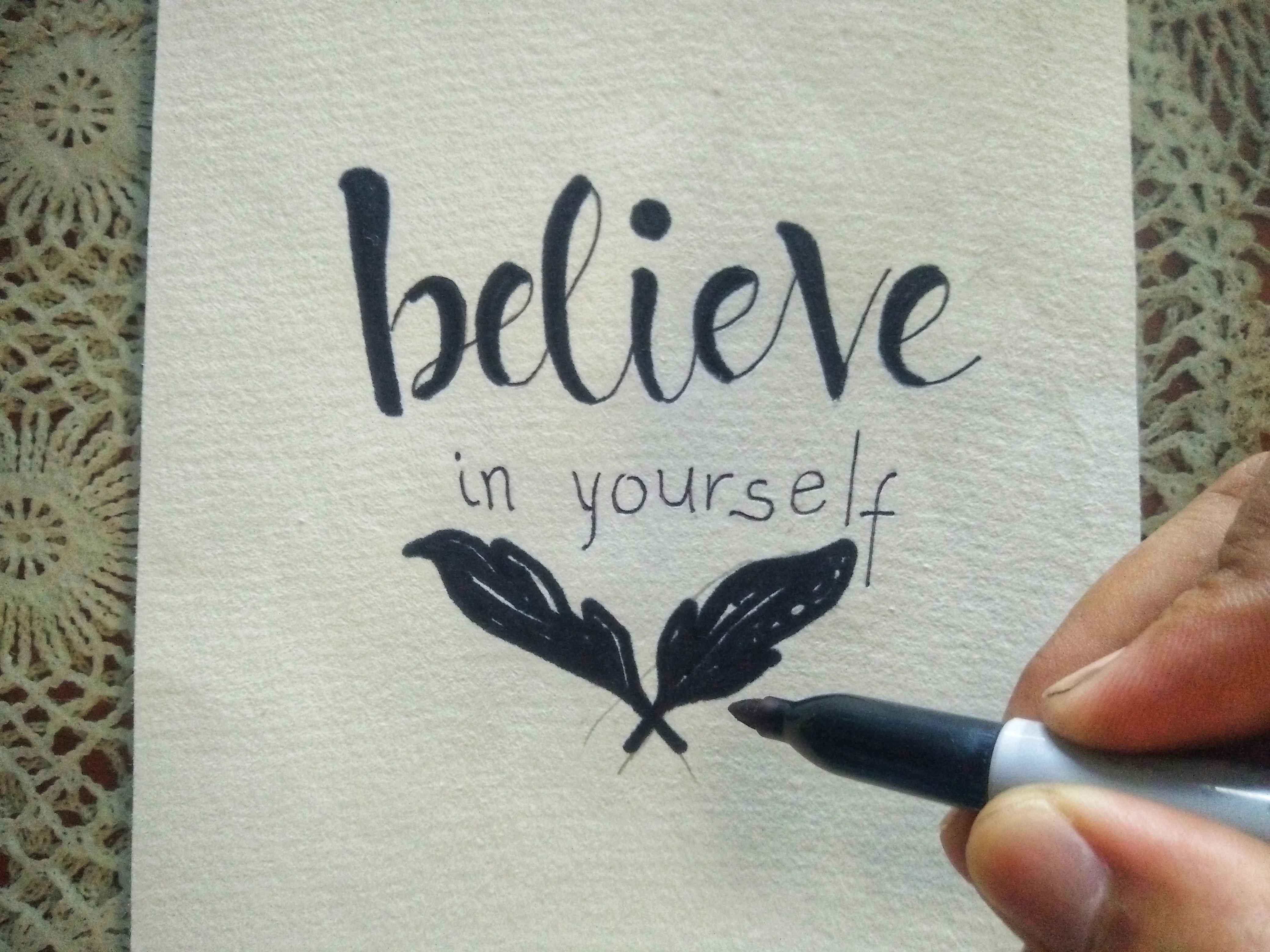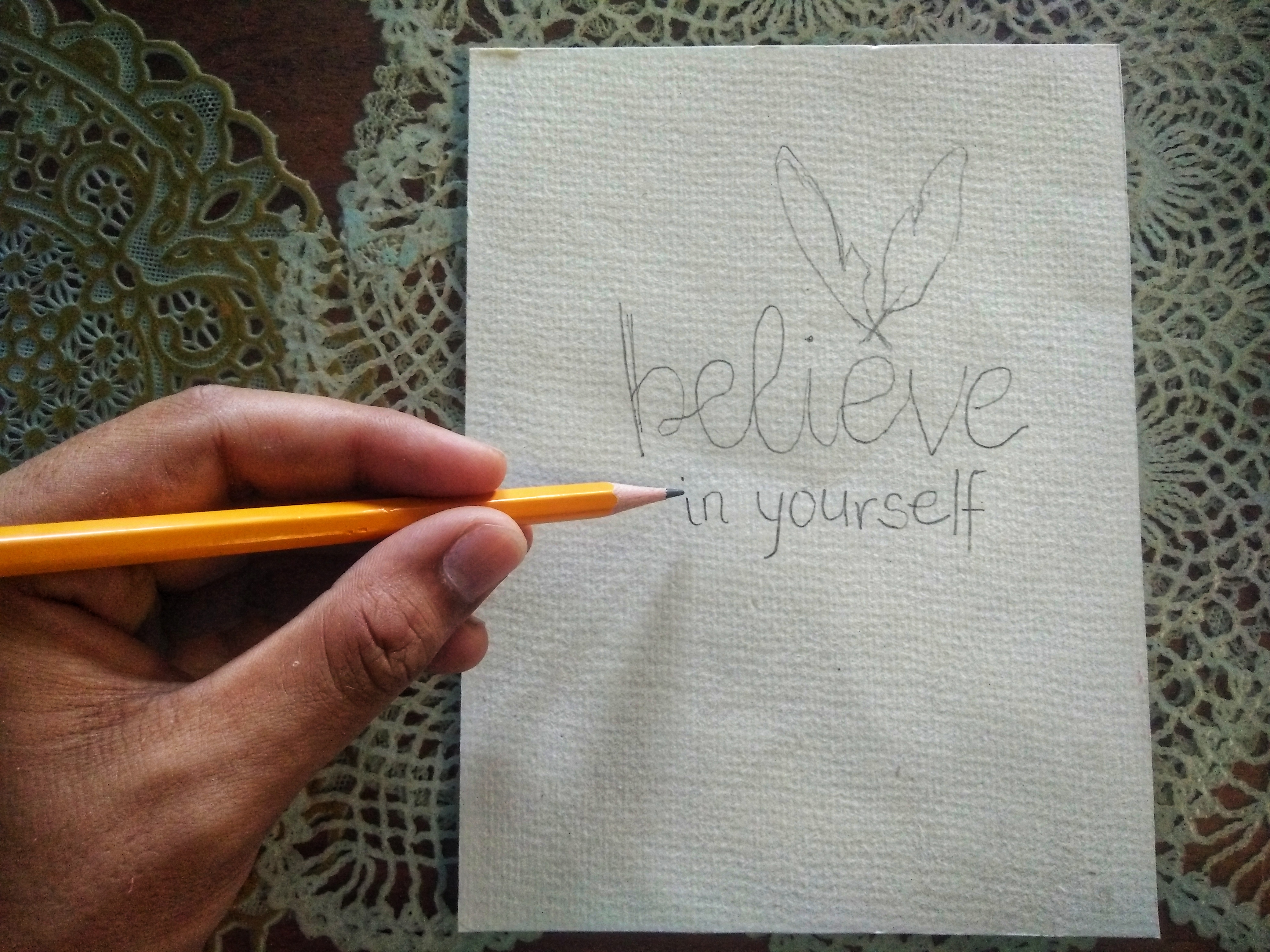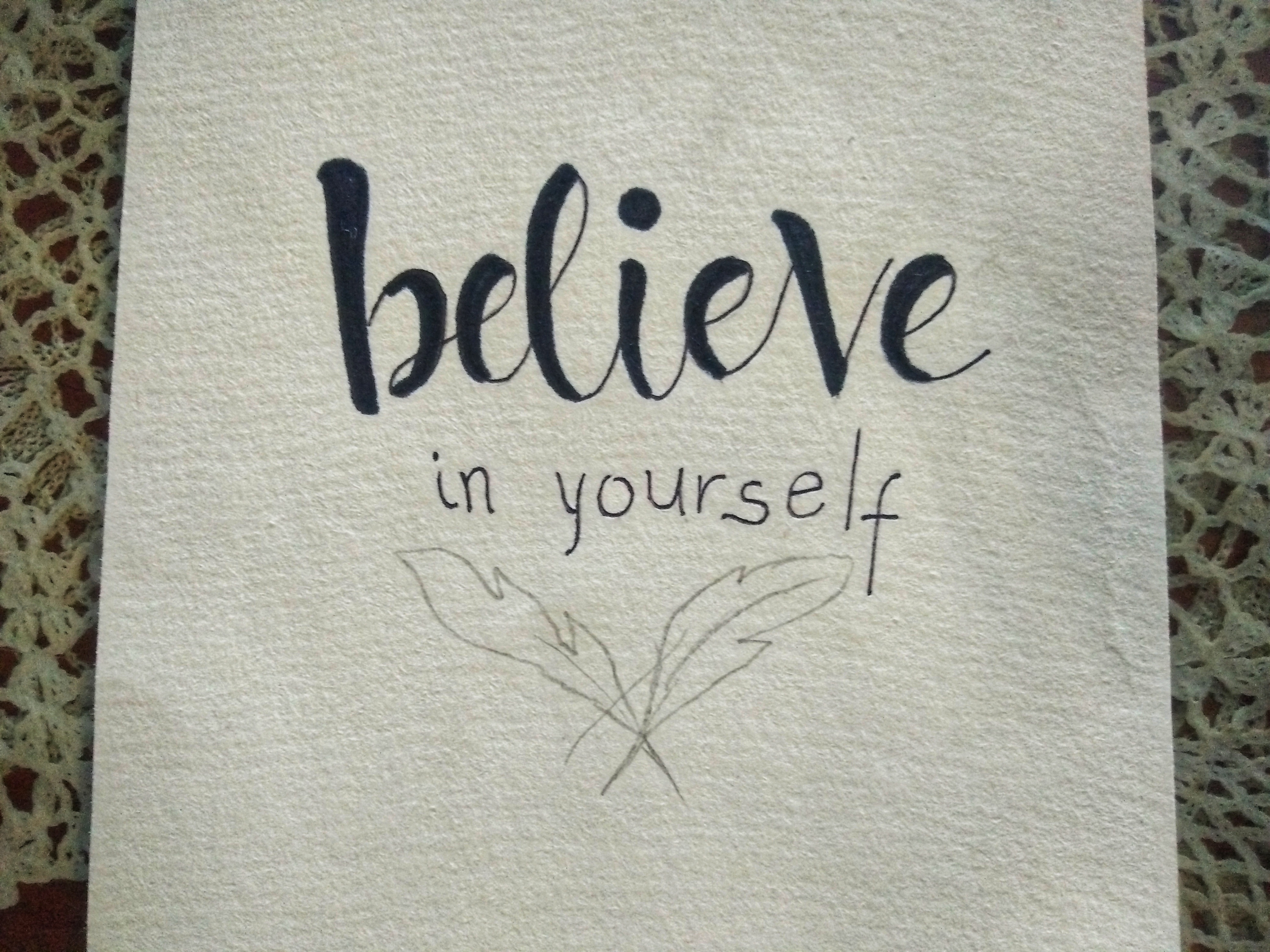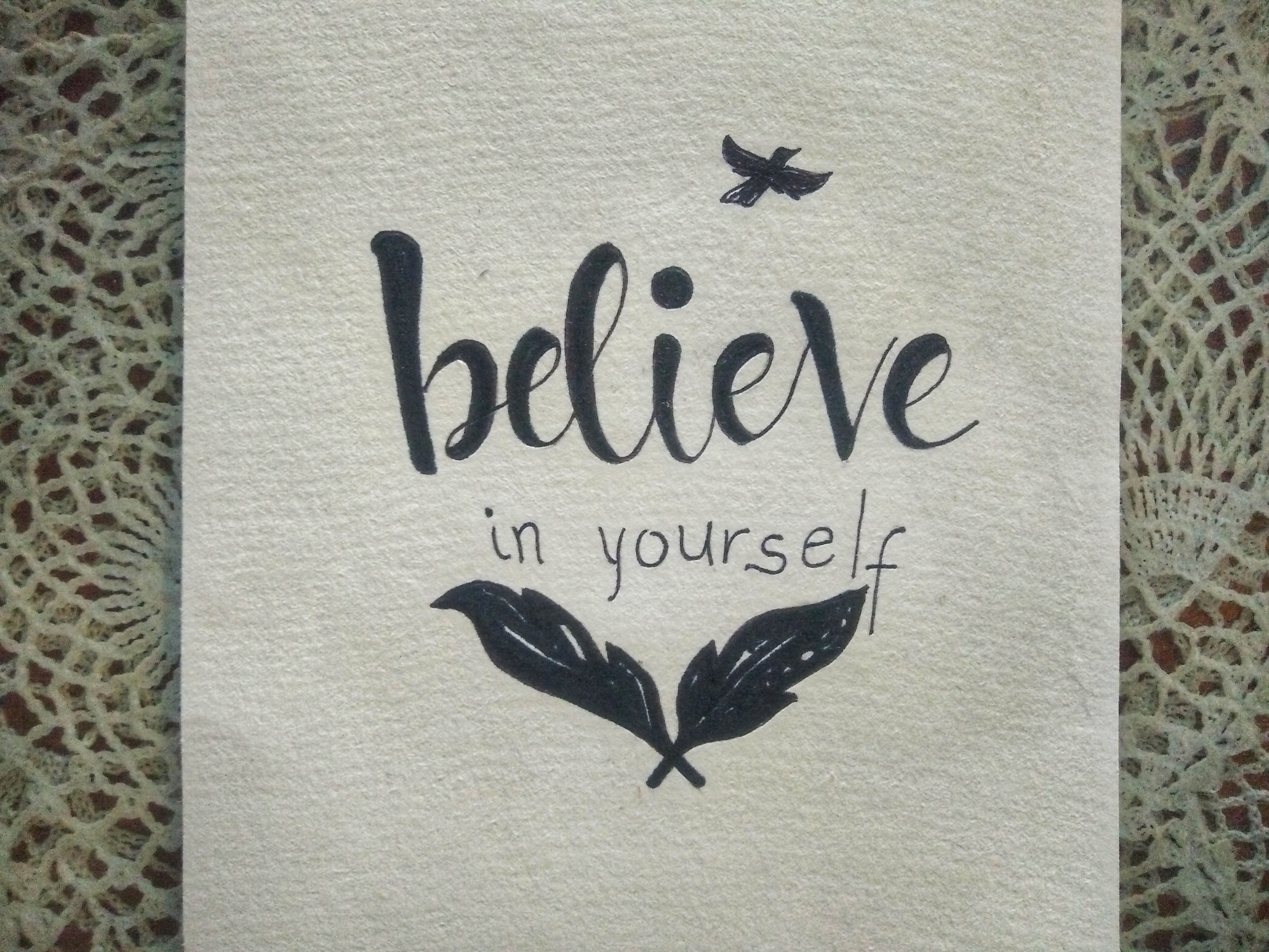 3.) When paper is cut already, sketch your words out from the heart and express it on the medium. We use pencil so we could just erase if something goes wrong or out of balance. In this medium I wrote "Believe in yourself," that's what came to my mind first. I drew the feathers above the letterings but erased it because I thought it isn't fitting.