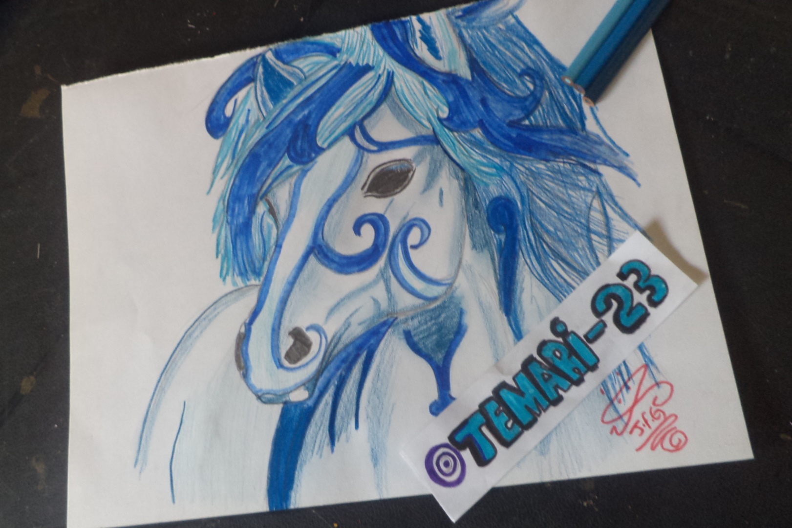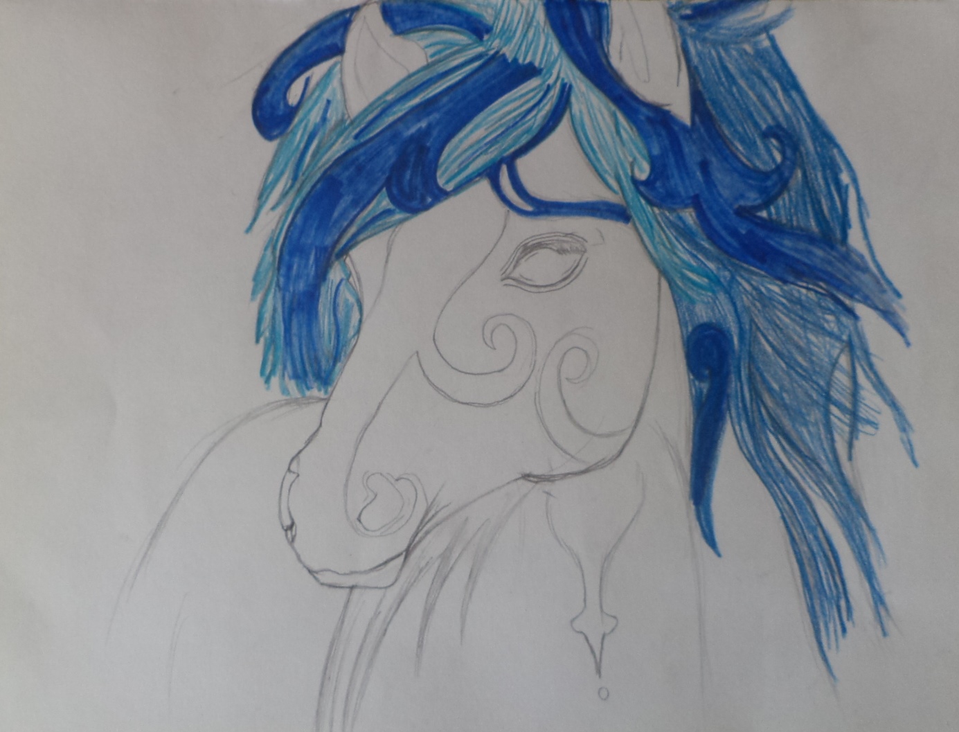 Primero comencé pintando el cabello, para hacerlo utilice un Color Azul Claro,Marcador Sharpie Azul y después Cambie a un Azul Oscuro ,luego pinte la cara del caballo para hacerlo utilice Color Azul Oscuro y con mi dedo lo pase por encima de este para hacer una sombra azul,Marcador Sharpie Azul y un poco de Azul Claro...