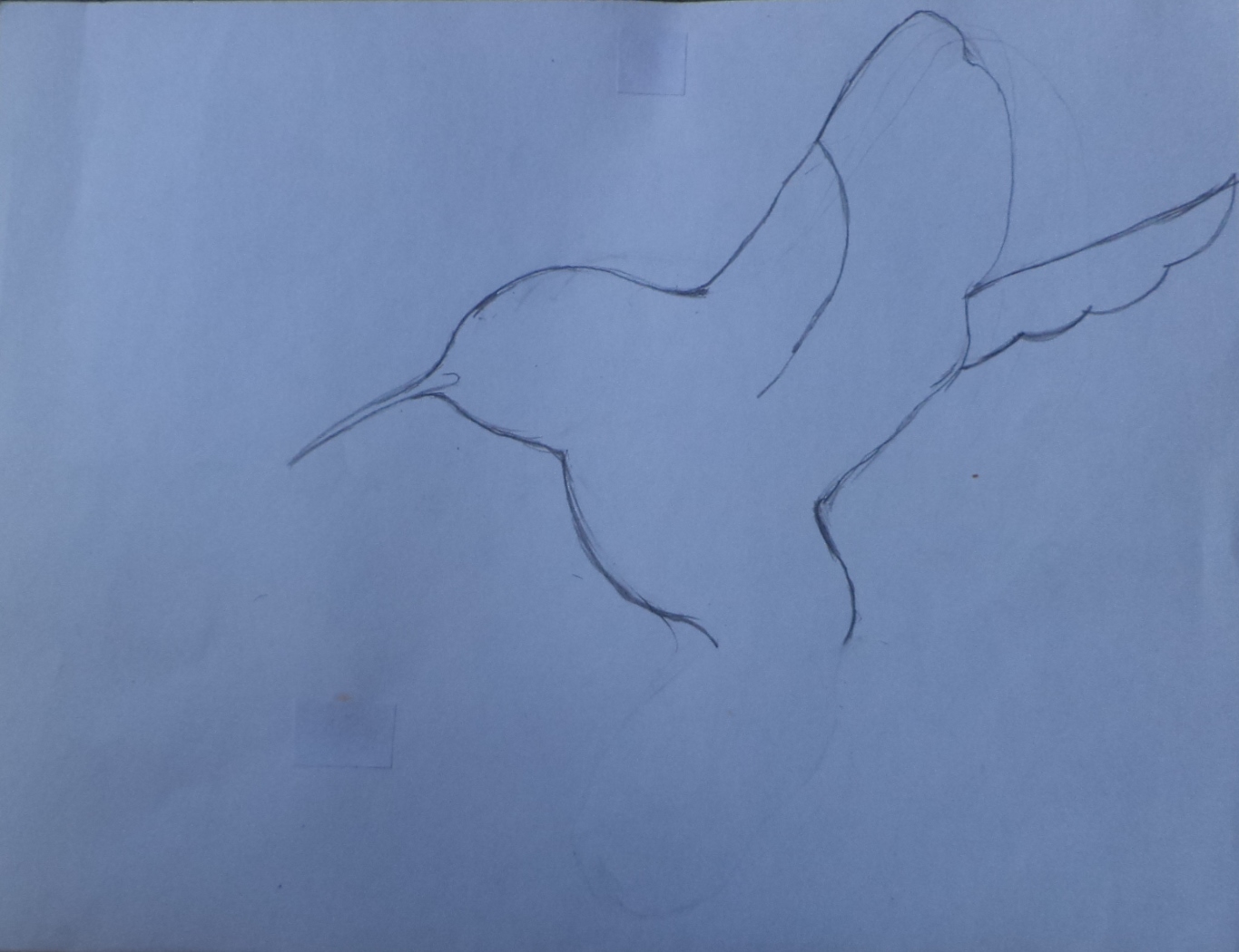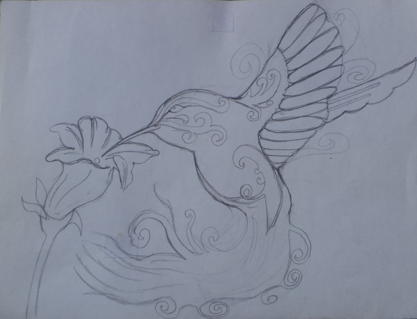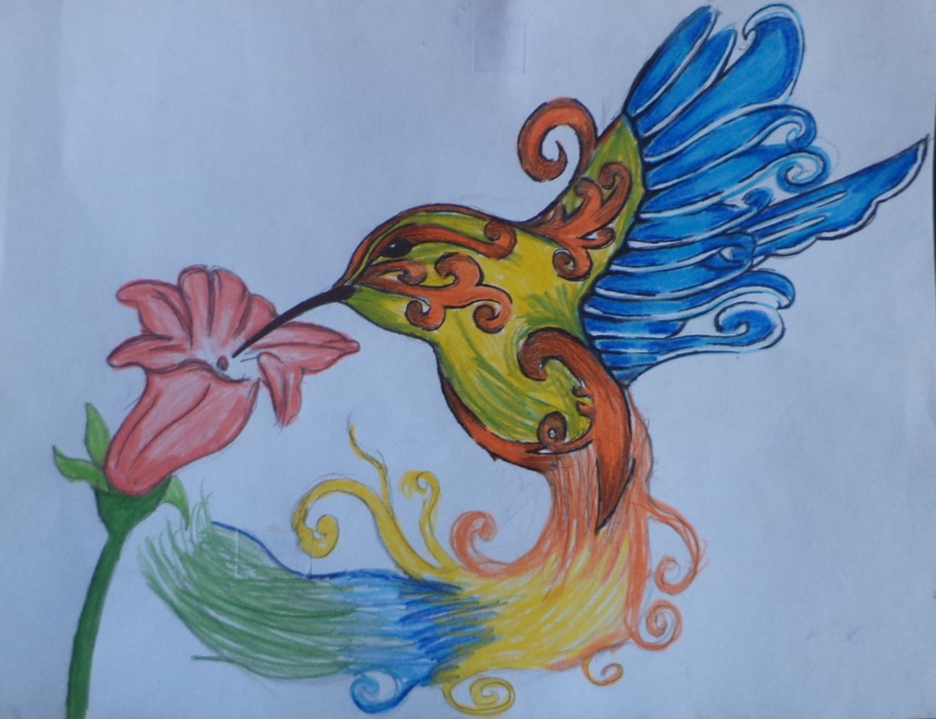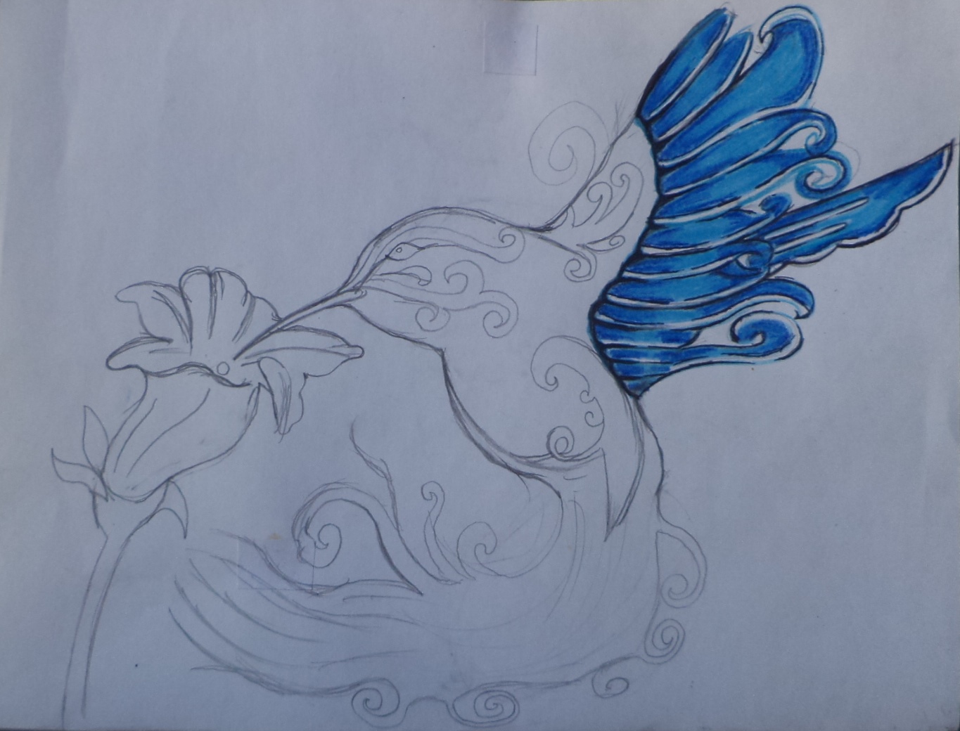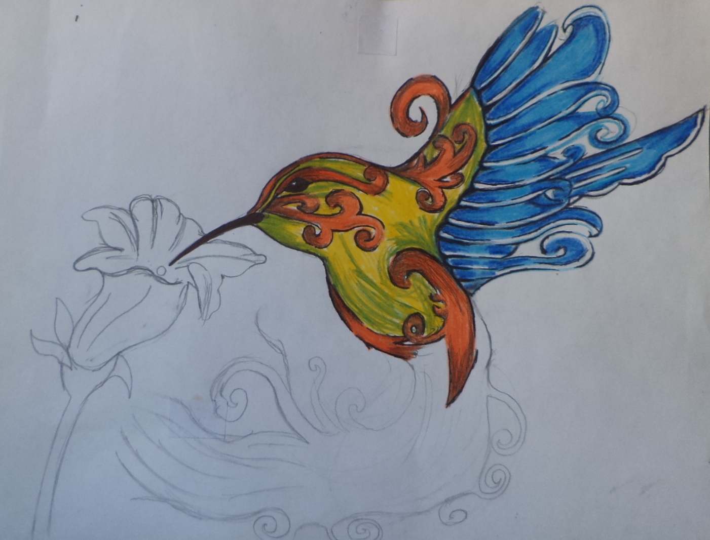 Primero dibuje la forma del Colibrí y después le hice los detalles,los cuales son una cola larga con plumas sueltas y las alas de plumaje largo y que estuviera succionando una flor