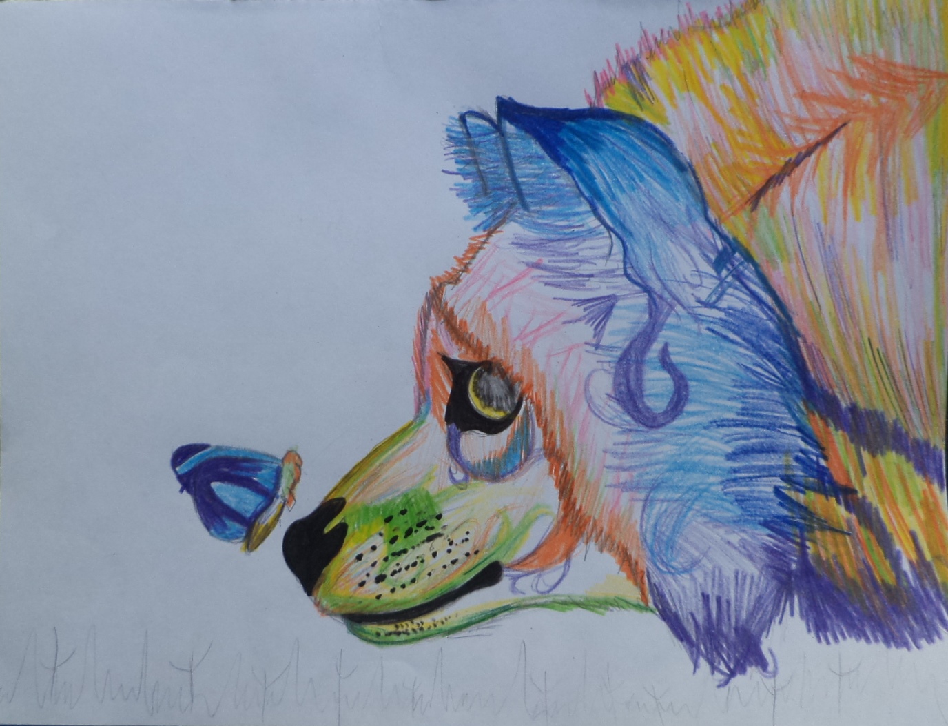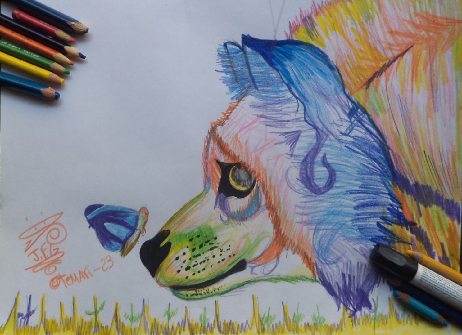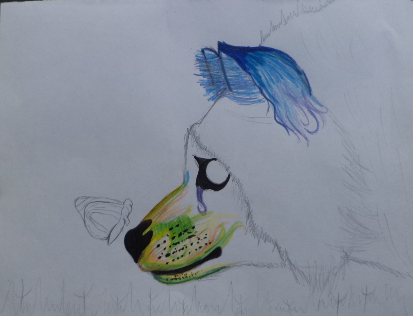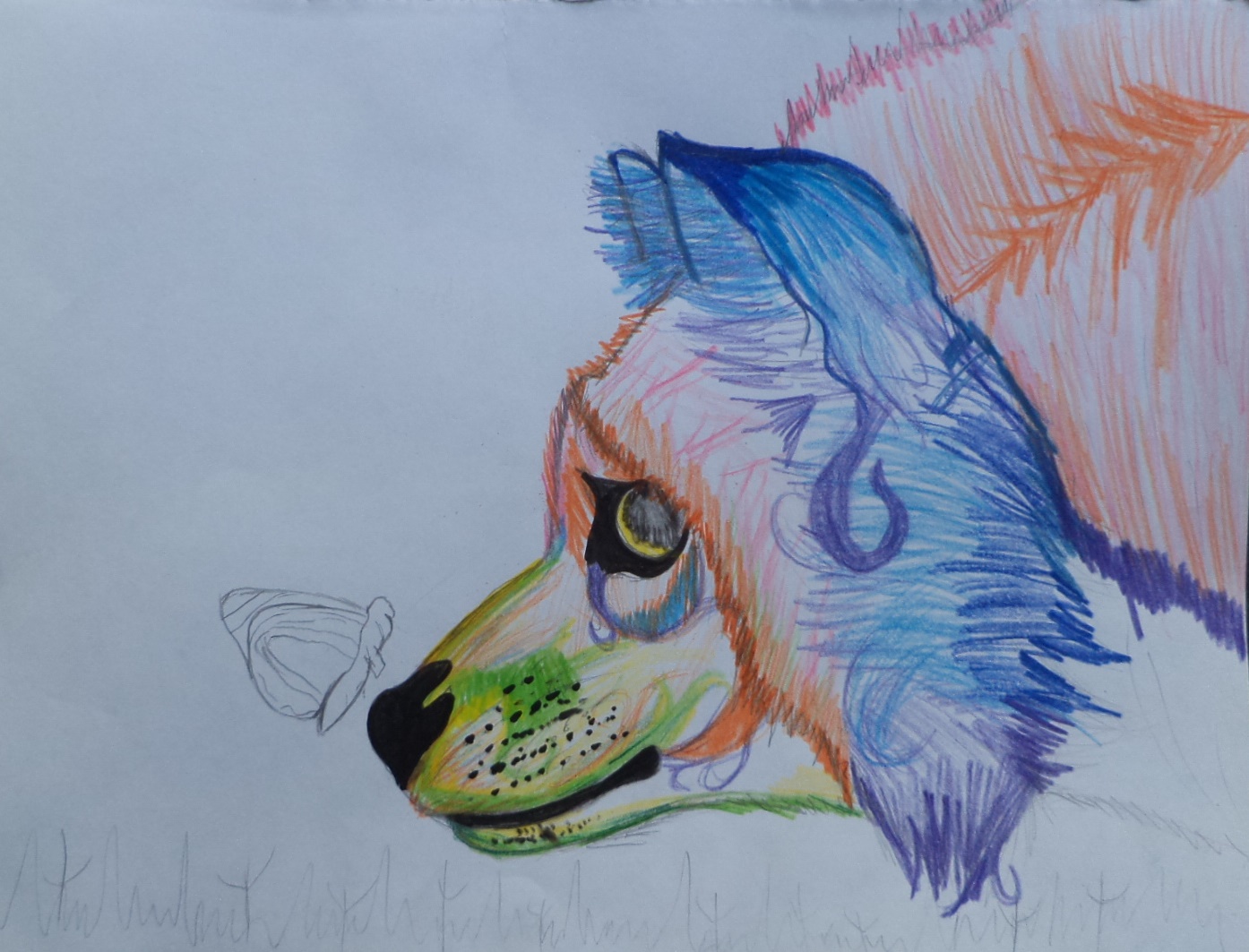 Comencé pintando las orejas para hacer utilice Color Azul Claro y Oscuro y Morado, luego pase a pintar la boca para hacerlo utilice Color verde,Amarillo y Naranja para hacer unos efectos del pelaje, para el ojo utilice Marcador Sharpie Negro y ya casi terminando pinte el pelaje que va por de tras de la cabeza, para hacerlo utilice Color Naranja,Amarillo,Verde y Morado, y por ultimo pinte la mariposa.