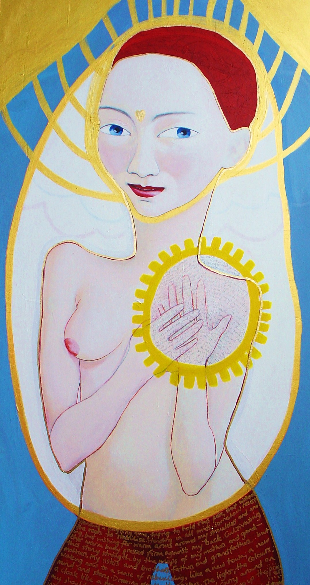 (painting, Standing Alone, oil paint-pen-pencil on board, 122 x 65 cm, 2006-10) - this painting began as a portrait of my mother and myself, around the time that I had been caring for her before she died - it then developed into a strong female figure stepping forward in life, which reflected also that I had just moved to Italy and was beginning a new life on my own. <3
