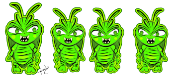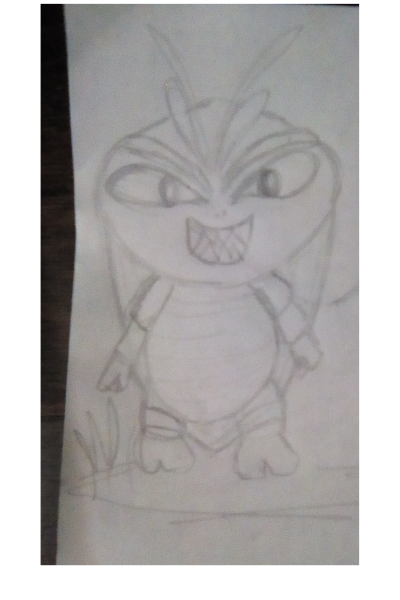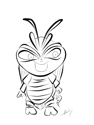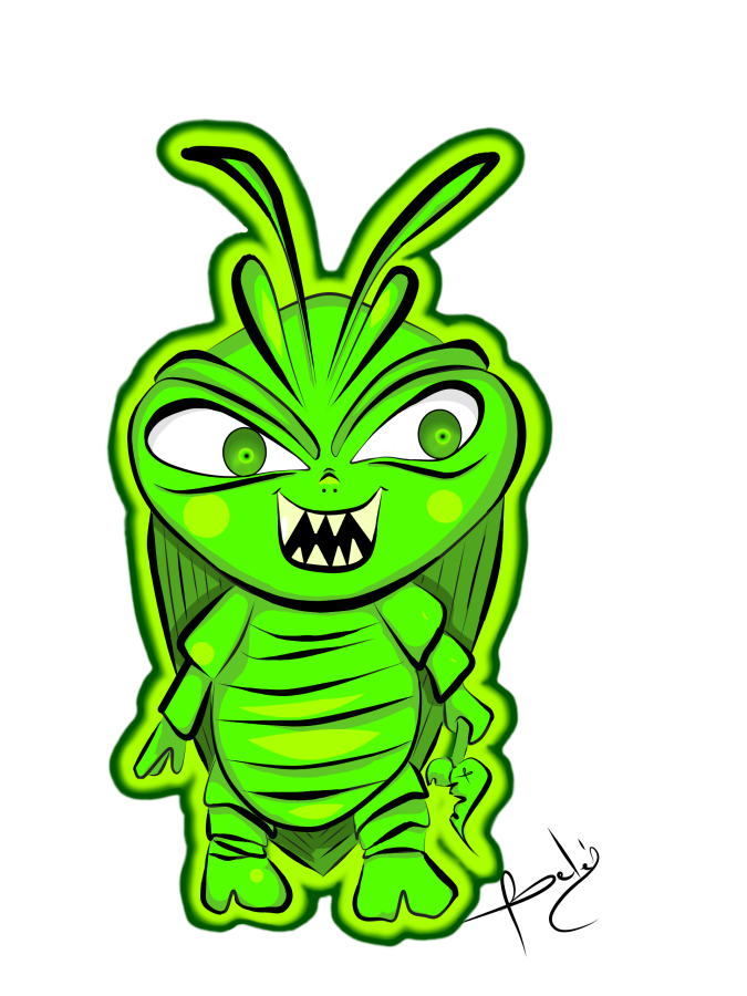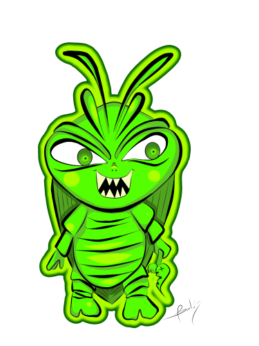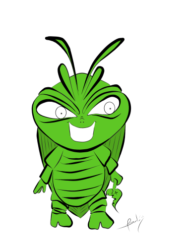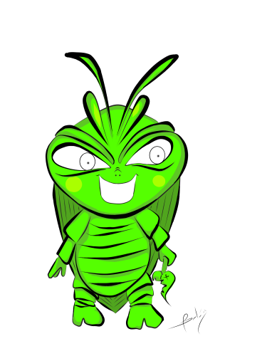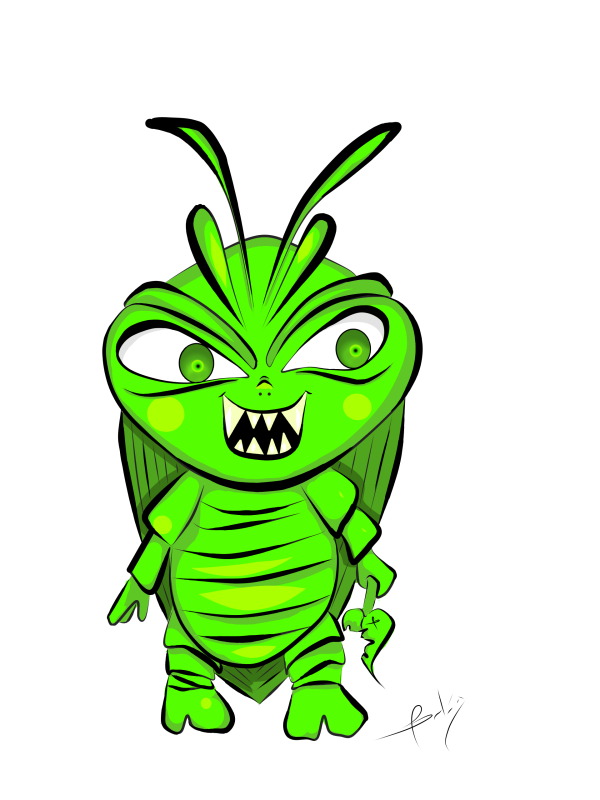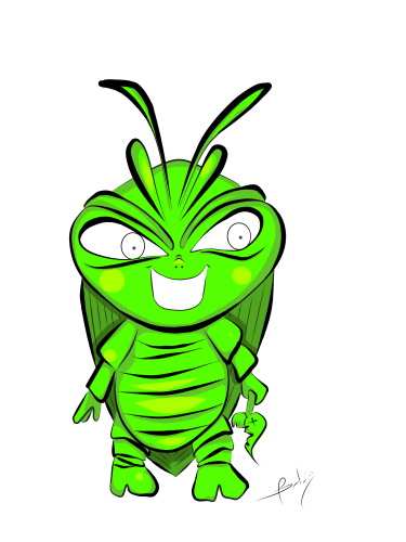 La ilustración que les traigo es la representación en caricatura de una cucarachita verde que mi hijo encontró entre las plantas, le llamo mucho la atención el color. El no las conocía, y yo en verdad tenia bastante tiempo que no las veía. Fué tema de conversación por largo rato, a tal punto que me preguntó si la podía tener de mascota😨... A lo que le respondí rápidamente: que te parece si la dibujamos?.. buscando con esto distraerlo para que se le olvidara el asunto de adoptar a la cucaracha😳... Nos fuimos por lápiz y papel y comenzamos a dibujar a nuestra amiguita. Le pusimos colmillos, una cara terrorifica como dice él 😄 y una hojita. Según él, las hojitas son su comida preferida. así nació este personaje. Espero les guste.