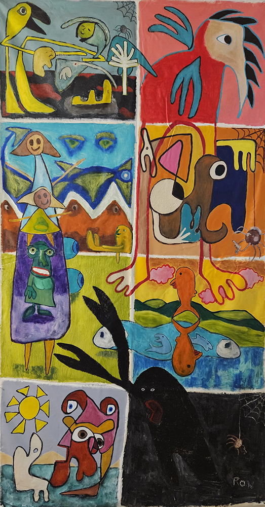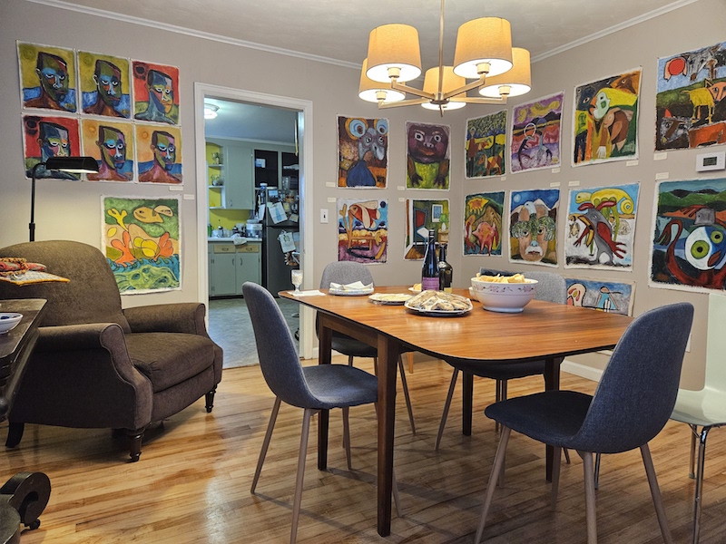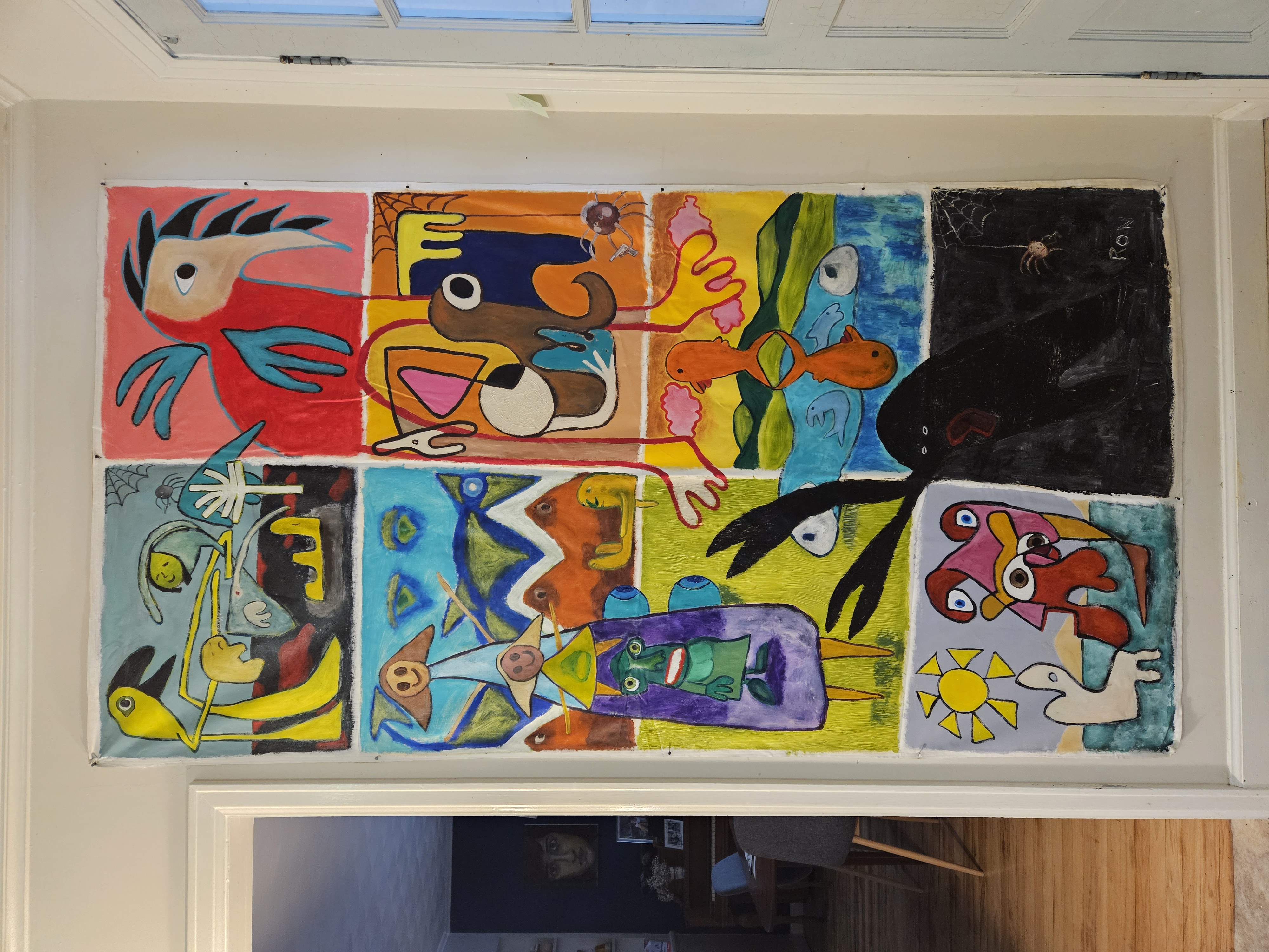 Yes, it was painted on the blackout curtain that a friend gave me, knowing that my expenses had to be kept low (supplies can get expensive!). The Friday min-exhibitions (here) began in autumn, 2023 and carried over until spring, 2024. I would hang a week’s worth of work in my dining room on Friday afternoon, and host a “happy hour”, inviting all and sundry over for tapas and cocktails. Sometimes we’d discuss the work, sometimes not.