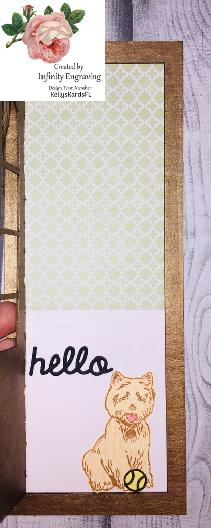 I used gold paint to pain the door and frame. I decided I wanted to create a surprise behind the door. I use some pretty green paper for the wallpaper and I used white card stock and my Martha Stewart scoring board to create bead board. I used another piece of white card stock to create the chair rail. I stamped a little dog that looks like my dog Honey and I added a tennis ball. I finished it off by adding a wreath with flowers and a bow on the front. I attached all of the pieces with hot glue.