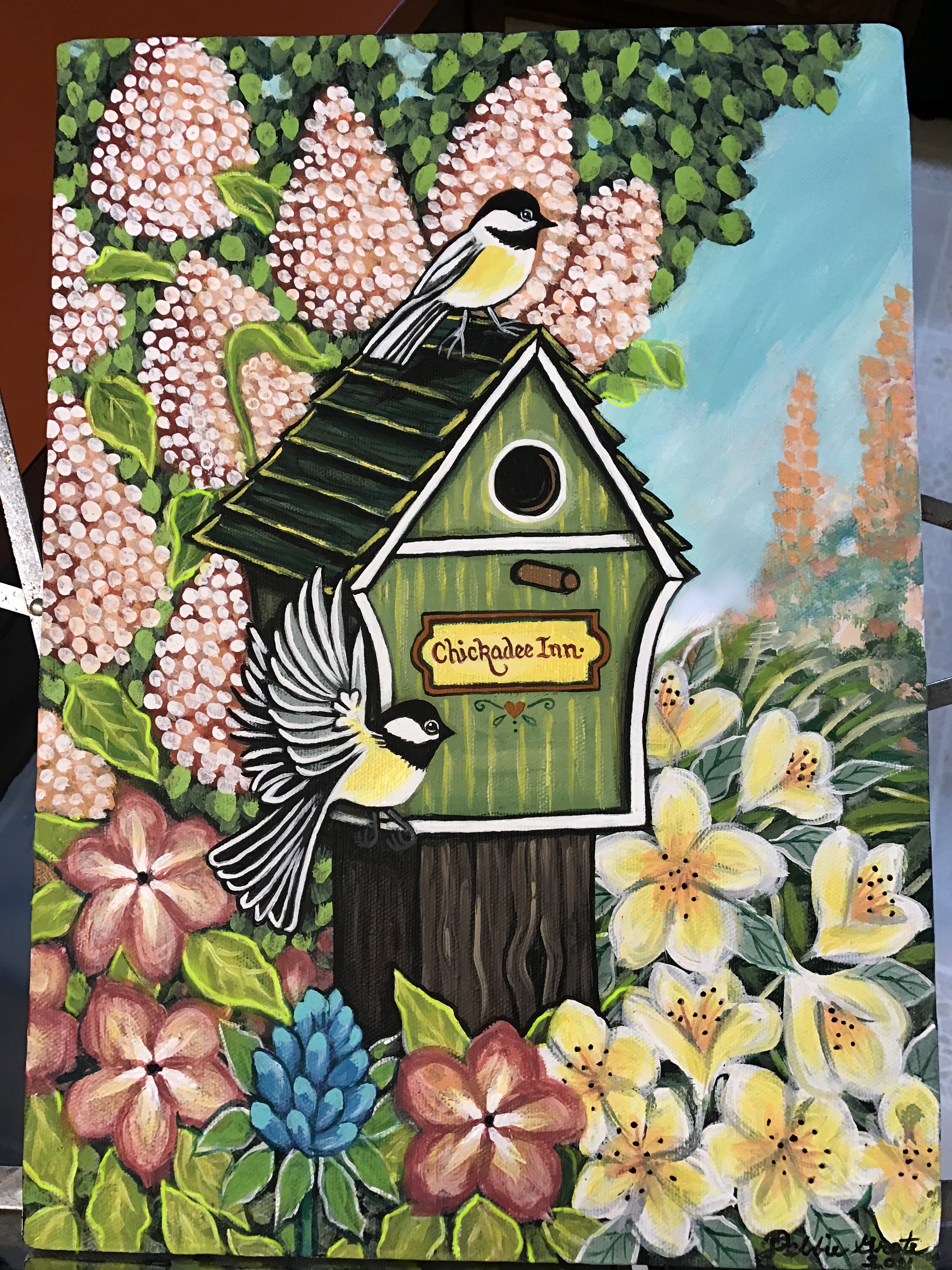 Oh... that’s beautiful @deemarshall, and look it’s got an adorable birdhouse like my painting. It’s a big one isn’t it? The green frame is perfect around it, and for the wall it is hung on. I love the font you decided upon. Did you design it yourself Dee? Wow it’s very good, a hell of a lot of work. What an amazing friend you are! I would definitely put this in the gallery ❣️
