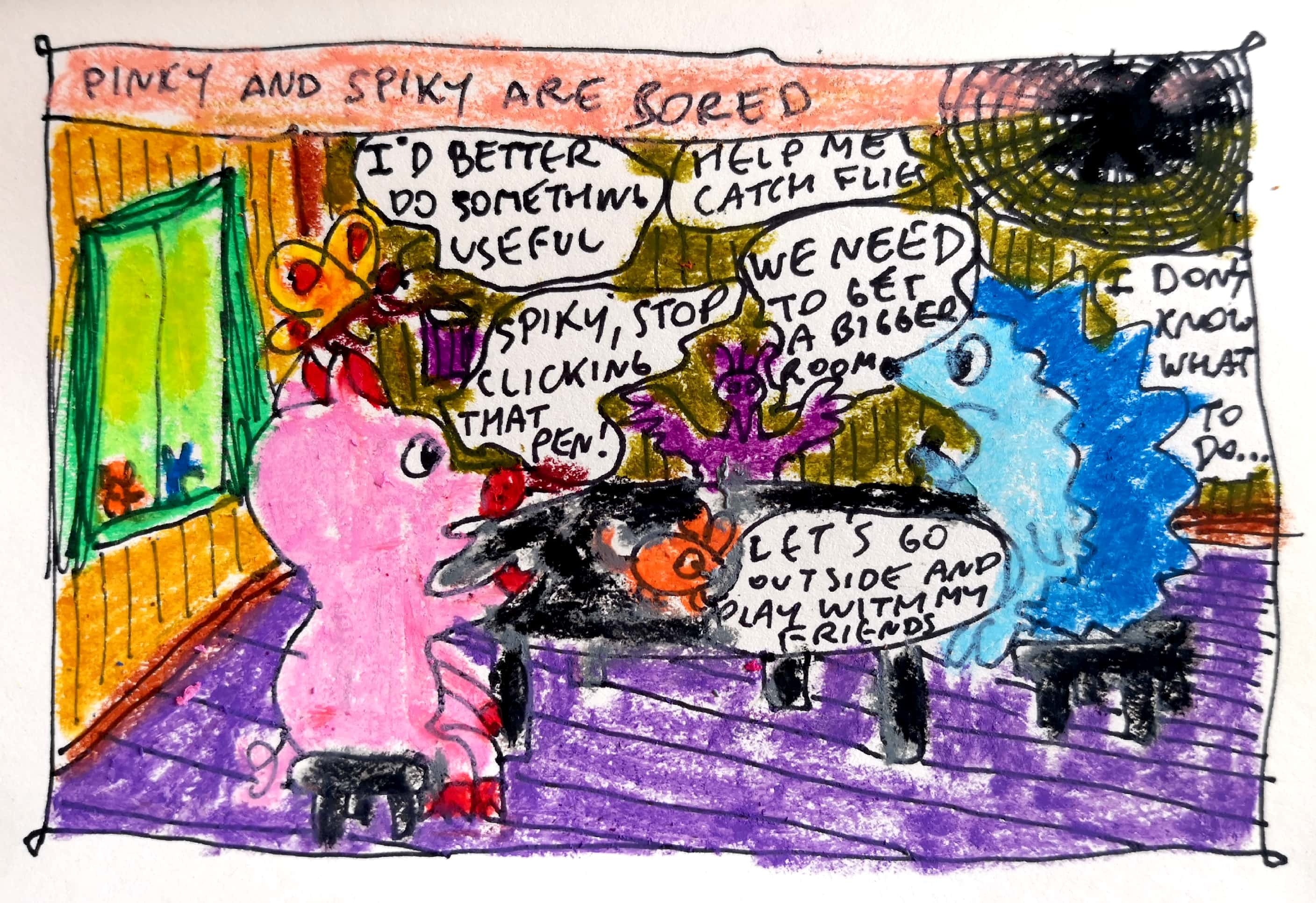 Here is my entry: https://steemit.com/artstorm/@organduo/pinky-and-spiky-are-bored-my-entry-for-artstorm-contest-32-day-2-theme-today-boredom-non-digital-art-category