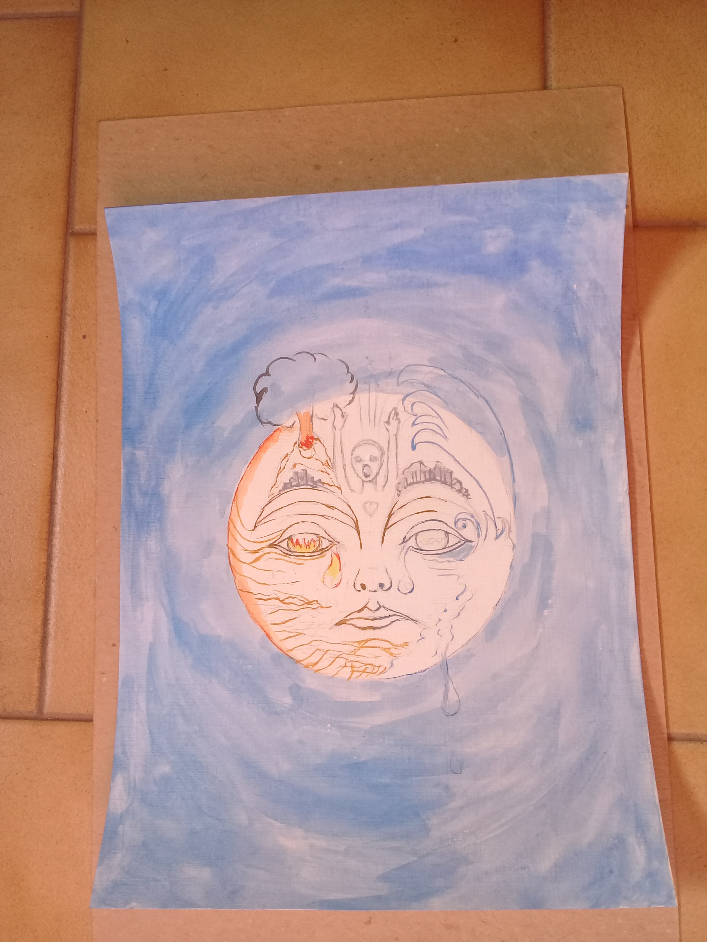 7- Después de muchas pinceladas aquí presento lo que más o menos imaginé. Decidí escanearlo para que el reflejo del acrílico (que es difícil fotografiar) no desluciera los colores.