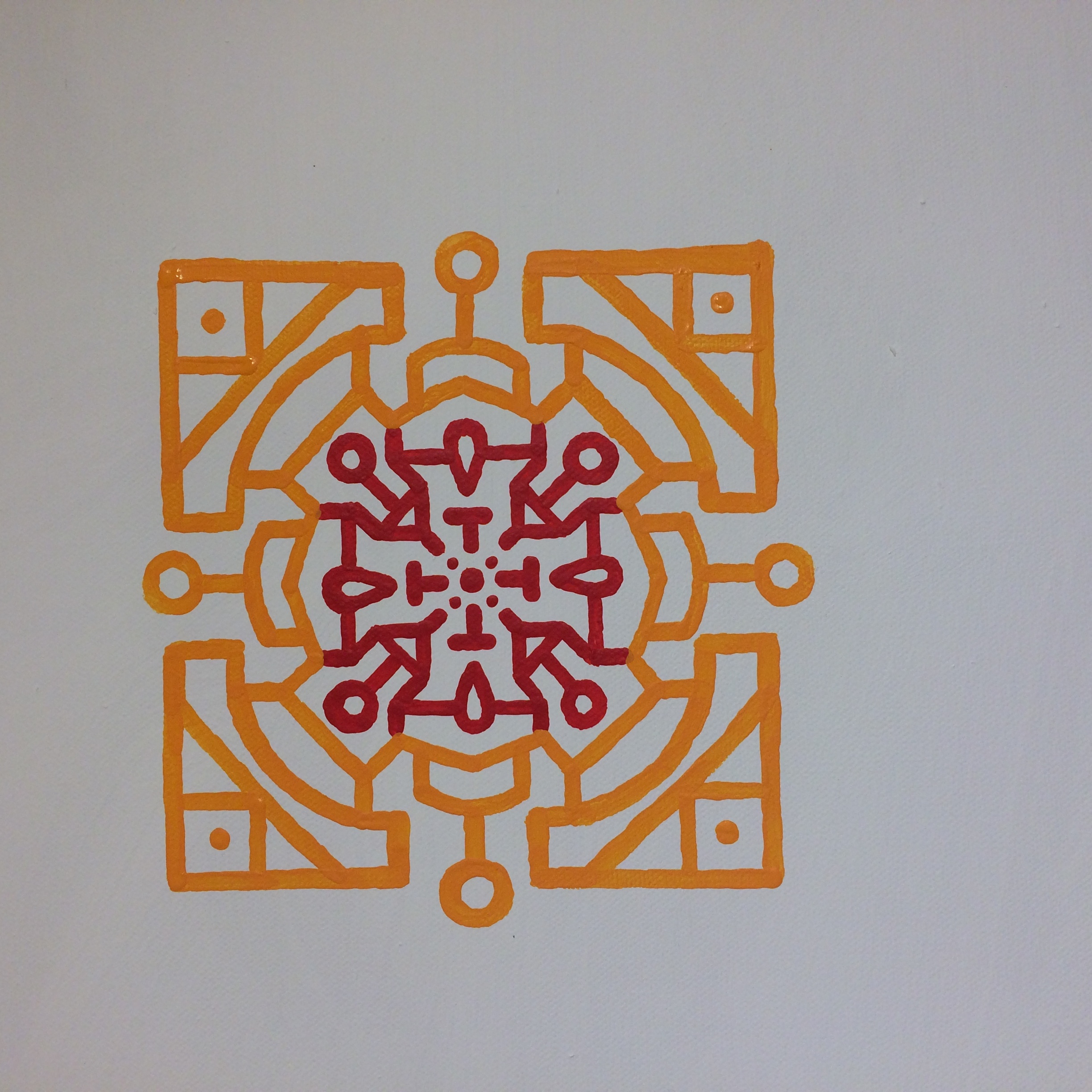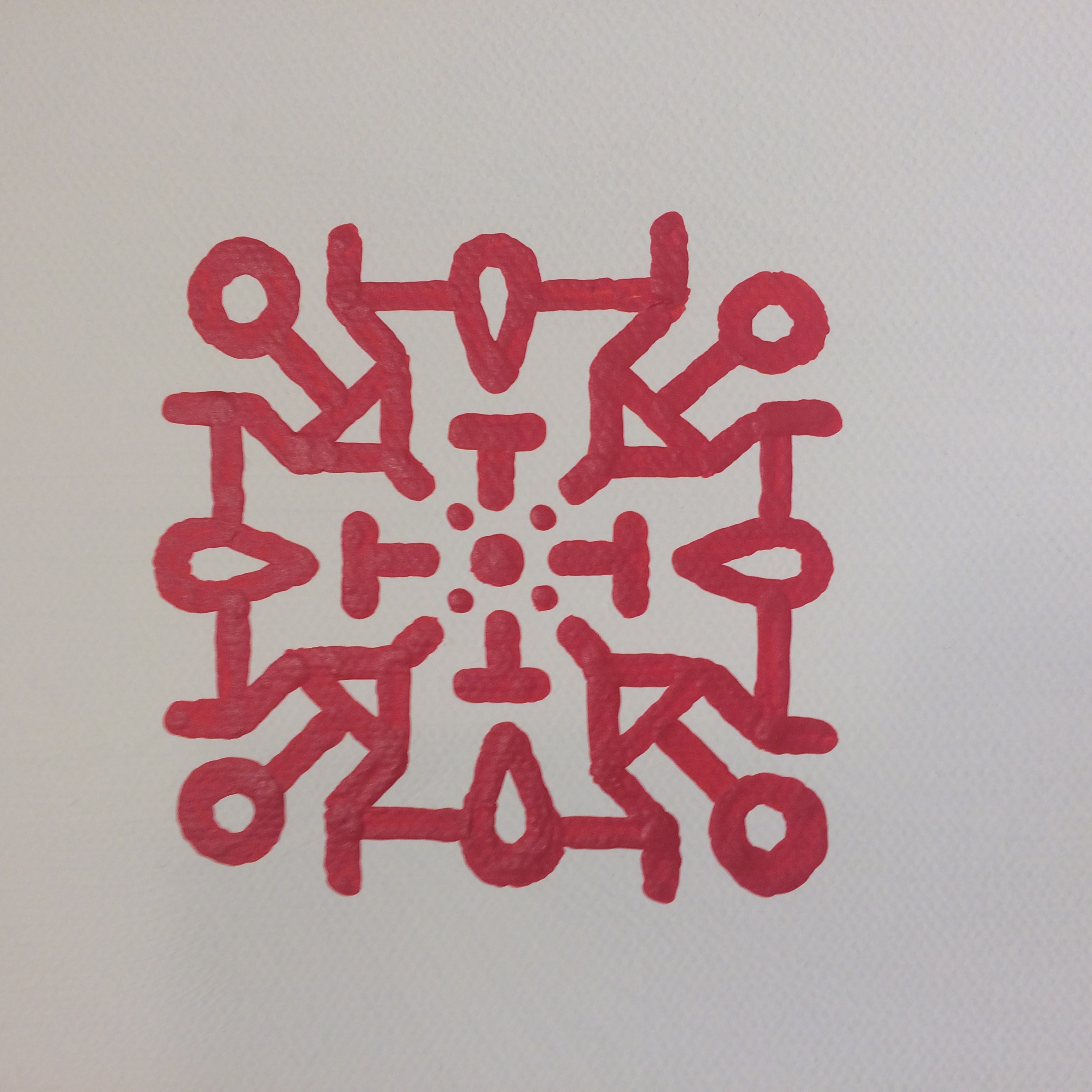 I started it off with red in the middle. For this one, I used a thicker brush than I did on the smaller canvas. I wanted the lines to be bold and distinctly visible from a reasonable distance.
