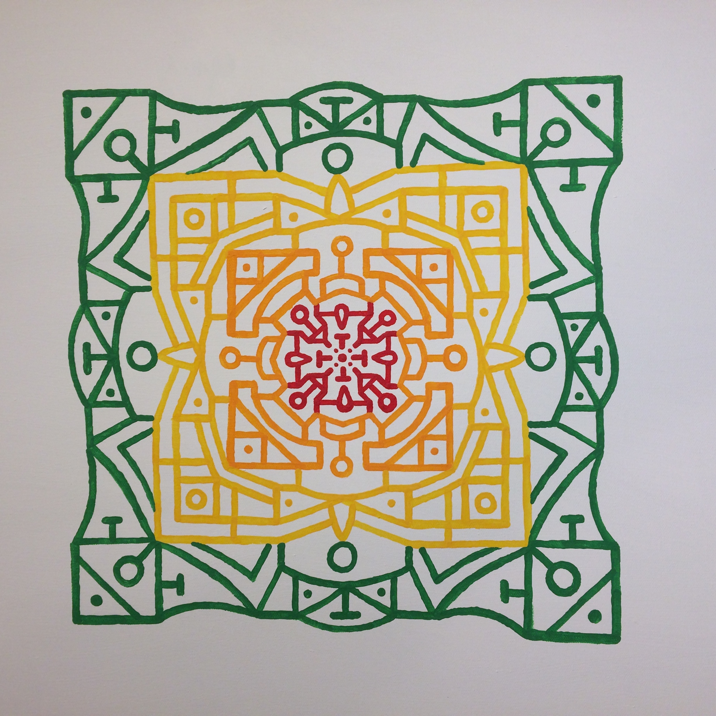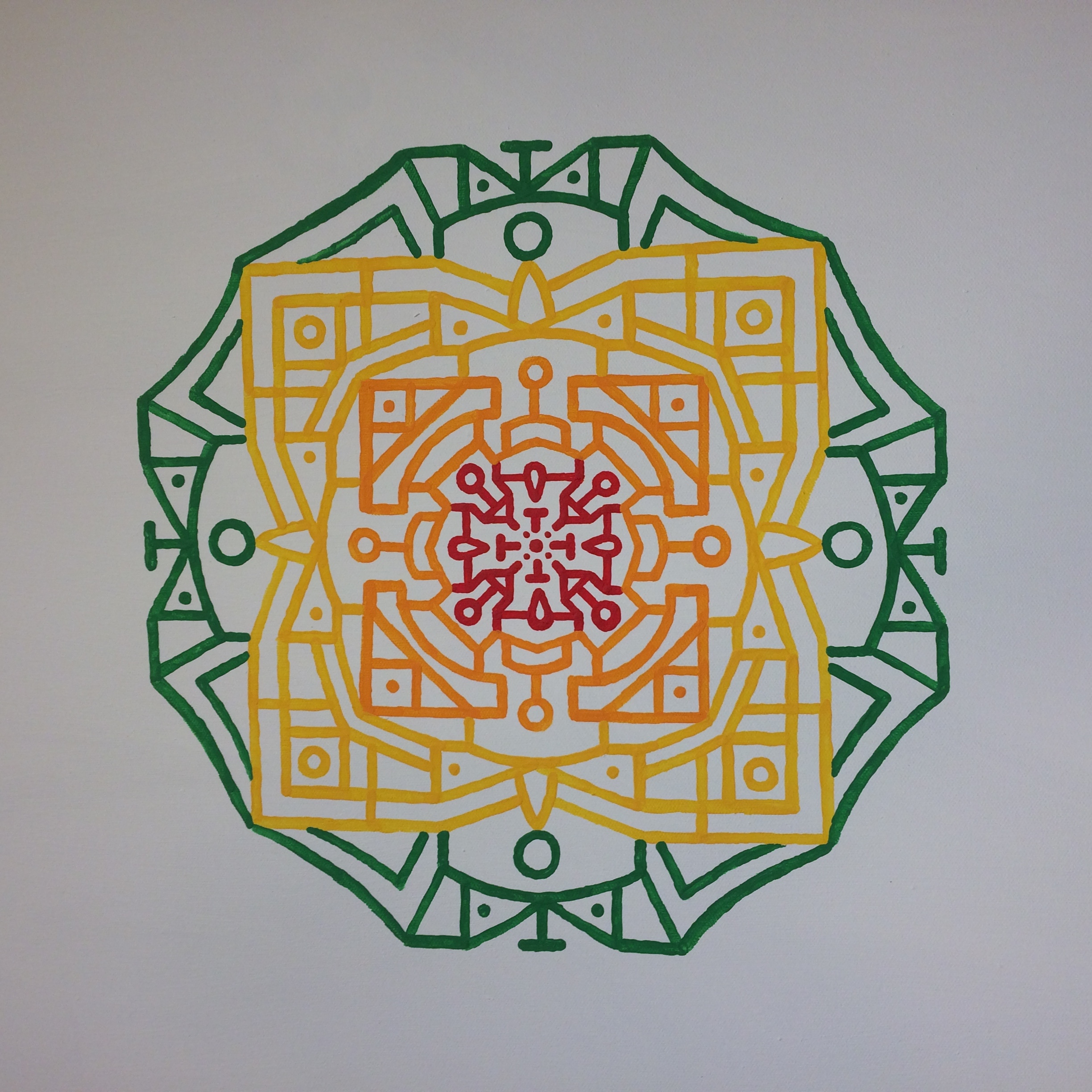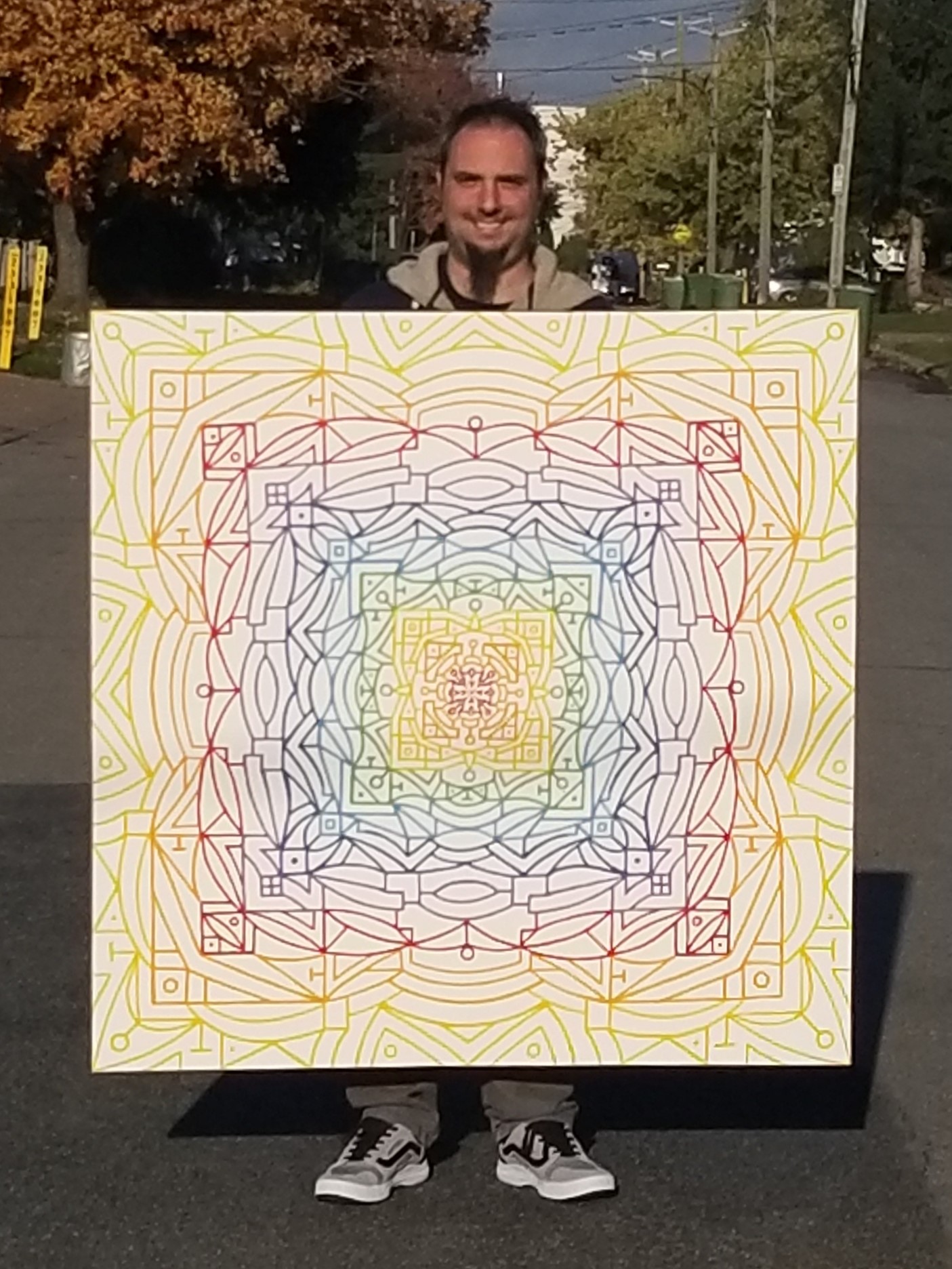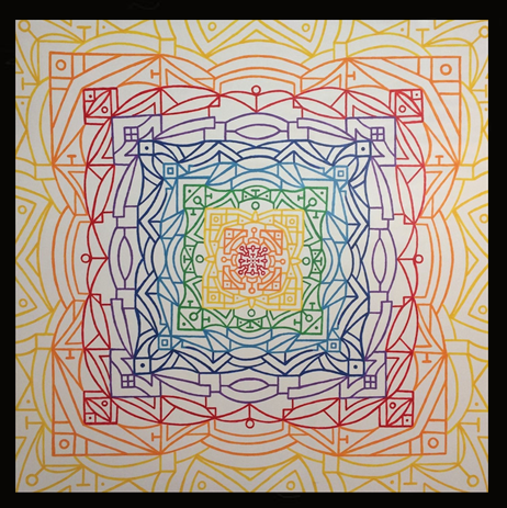 I started this painting at the end of August. I had just done a 12 x 12 inch rainbow Mandala, and it resonated with a lot of people. It actually got scooped up by one of my collectors right away! Since so many people really seemed to resonate with the Rainbow Mandala vibe, I decided to do one with the same idea - but on a much bigger 4 x 4 foot canvas!