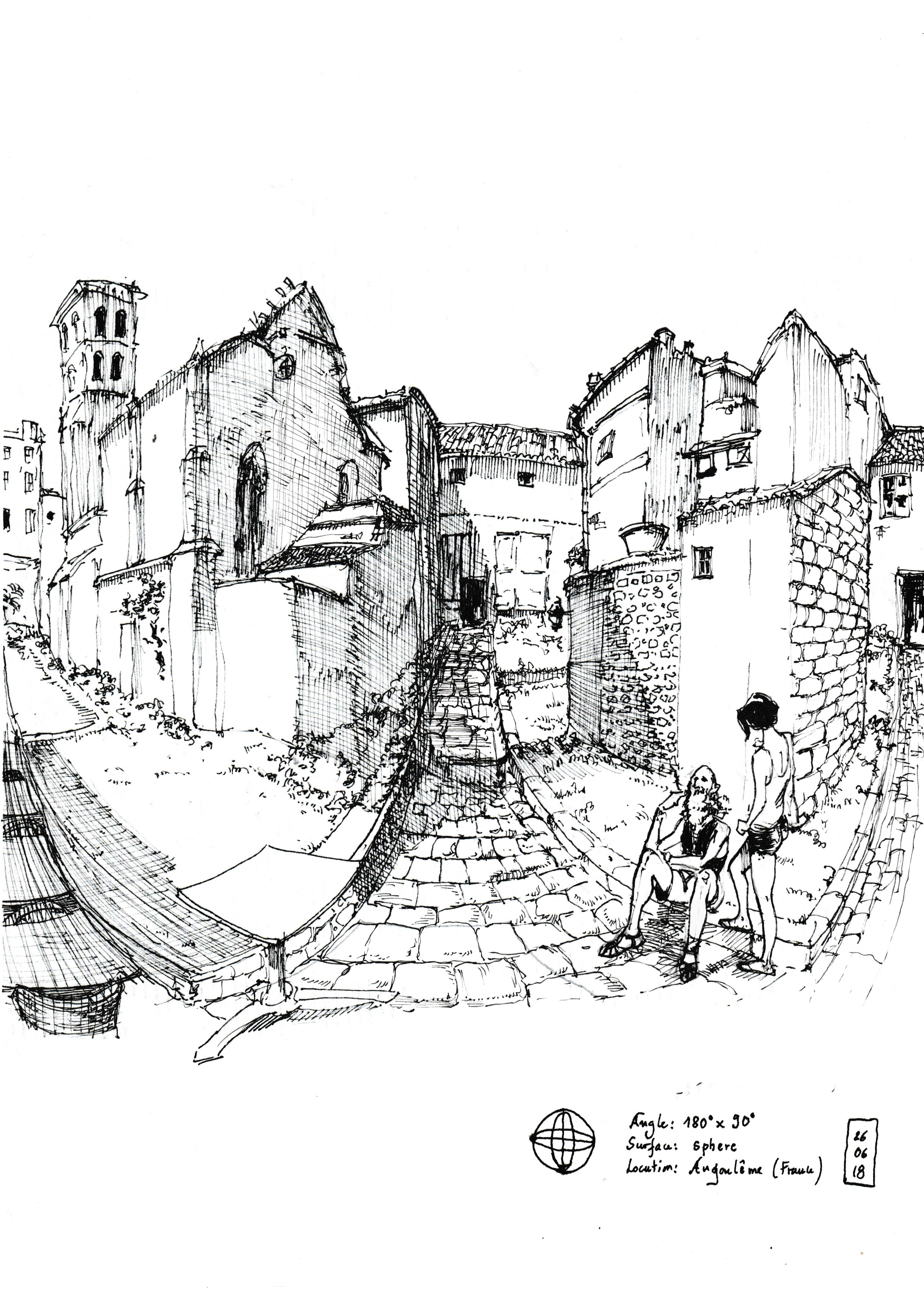 This is a curved space sketch in a flat support which a horizontal FOV of 180º. Just feel the curvature of the buildings, isn't amazing?
