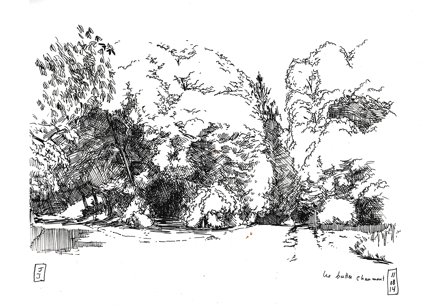 The straight horizon line divides the composition in two: trees and vegetation above and paths bellow.