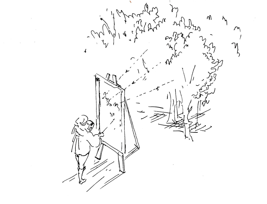 Either we are drawing from imagination or observation, in both cases, what we do is transfer visual information from one plane to another plane, like it is shown in this figure. Let's call the plane where we draw the projected surface.
