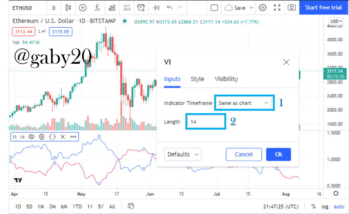 Este indicador utiliza una formula un tanto complicada, pero a pesar de eso es bastante fácil de usar e interpretar. Al hacer los cálculos se trazan dos líneas oscilantes llamadas VI+ y VI-.