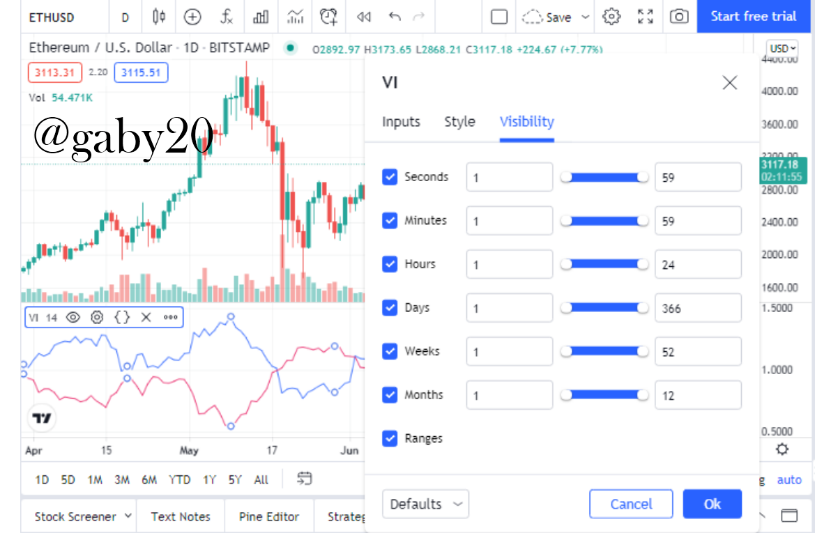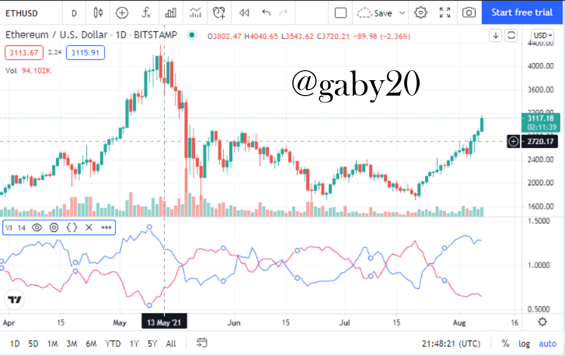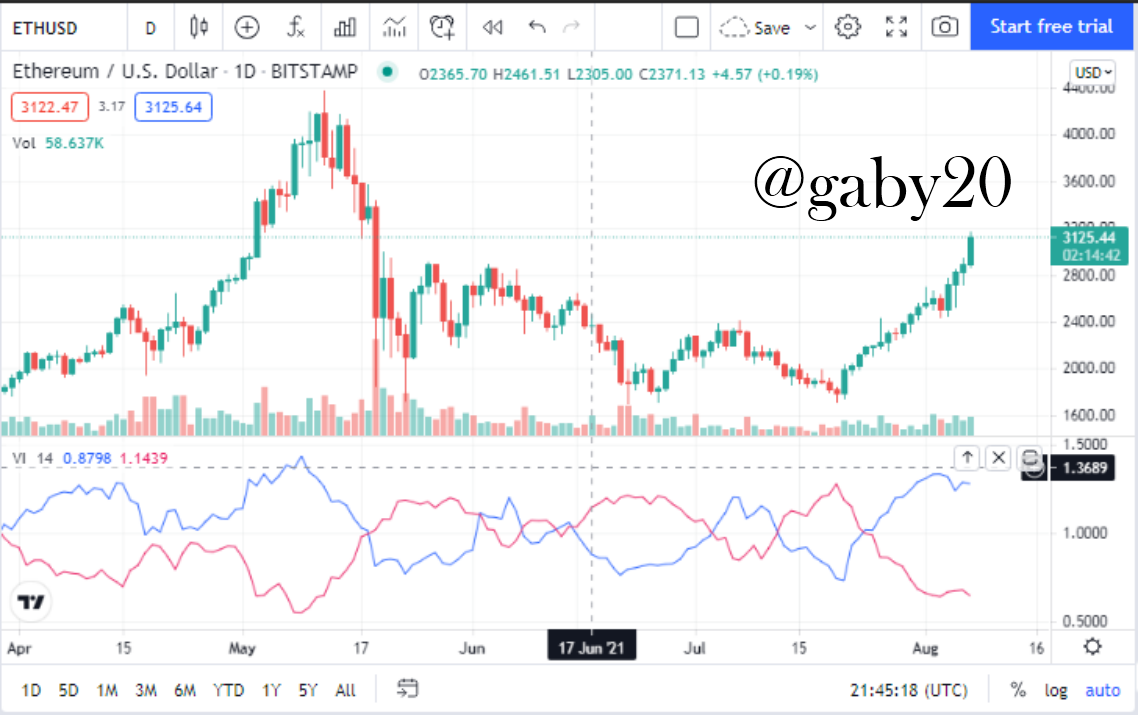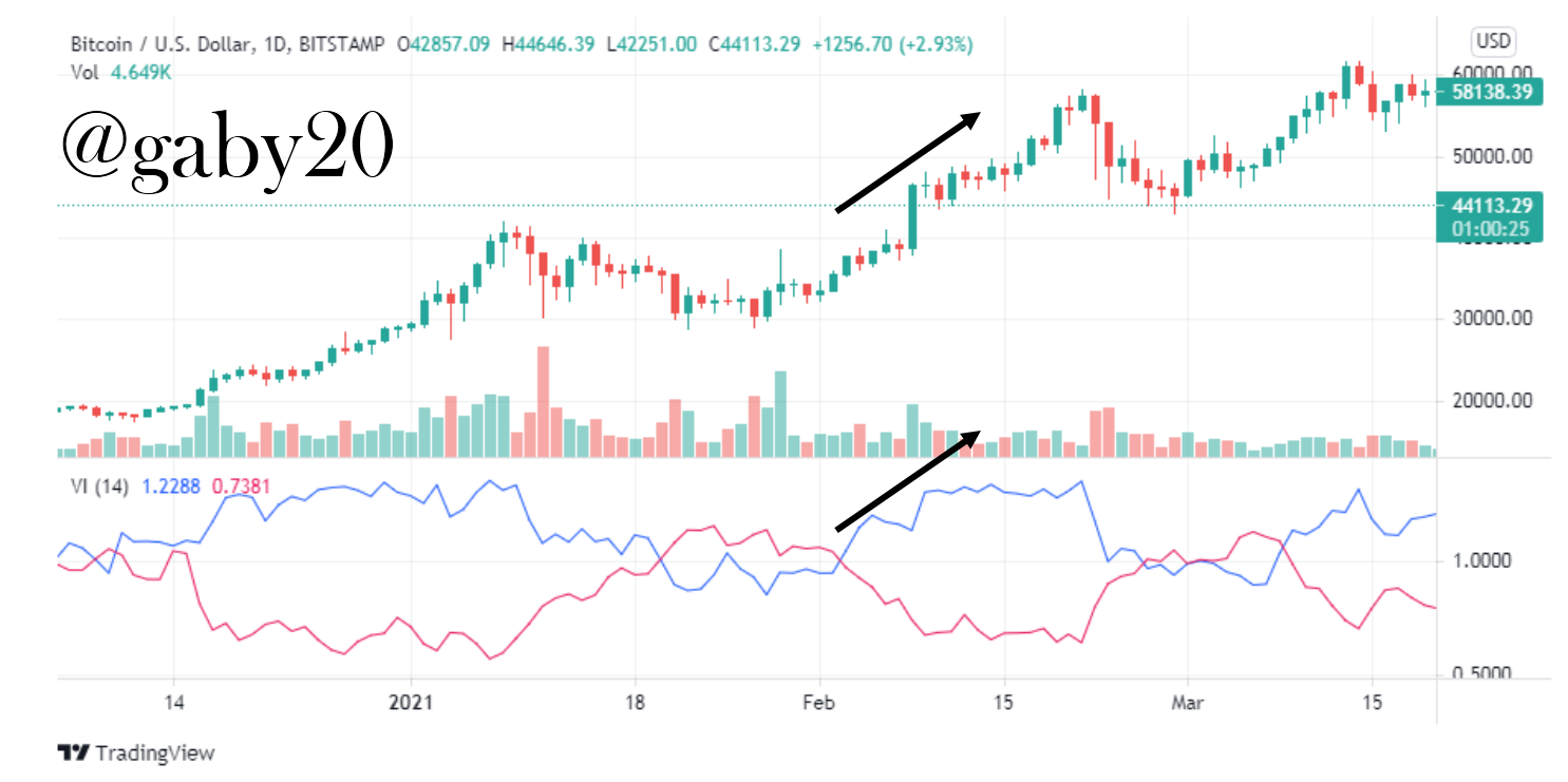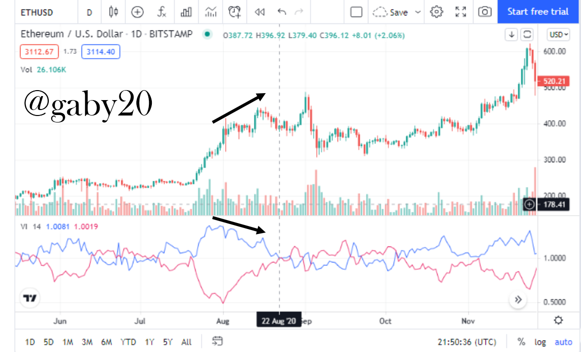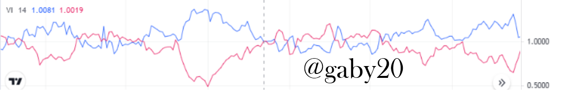 Podemos ver que luego de este cruce la tendencia va en aumento, por lo que en ese punto es un buen momento para comprar activos de esta moneda, también se observa que la línea VI+ va en la misma dirección del precio del mercado por lo que nos da una idea de cómo será.