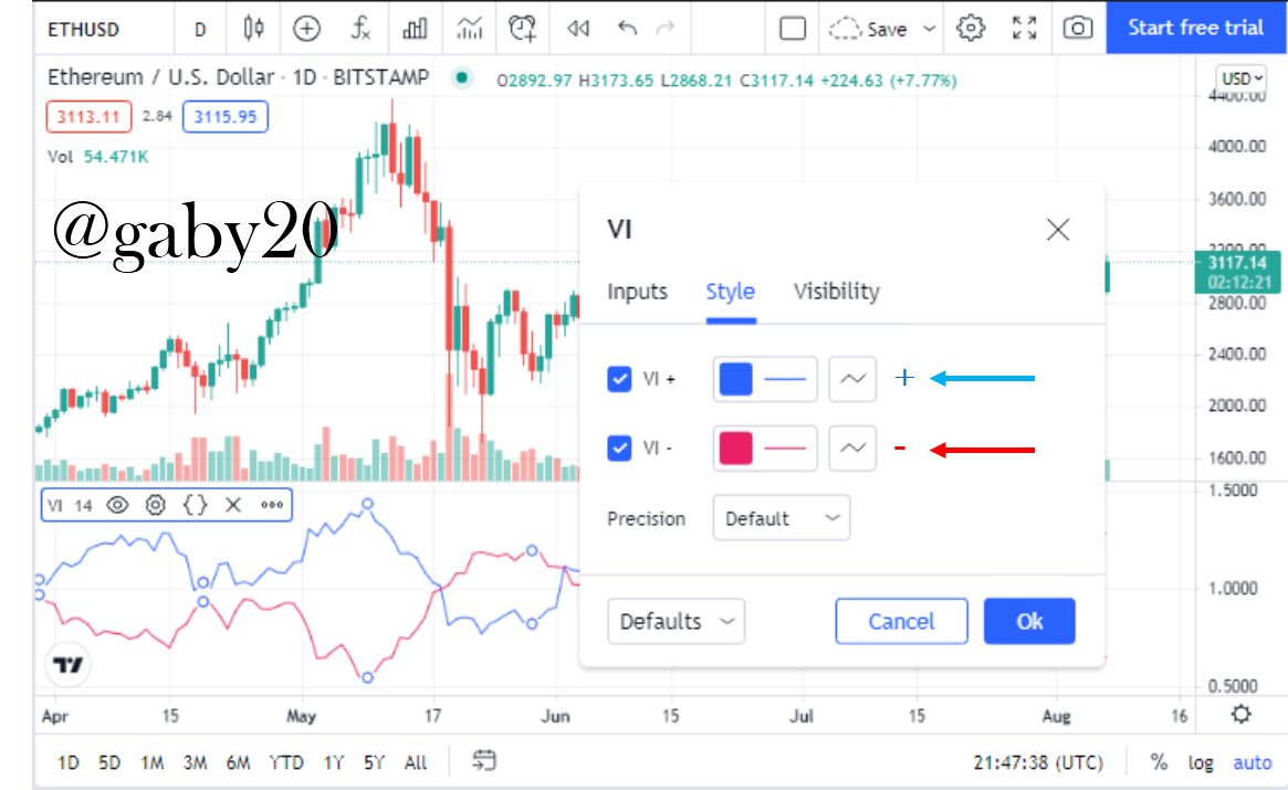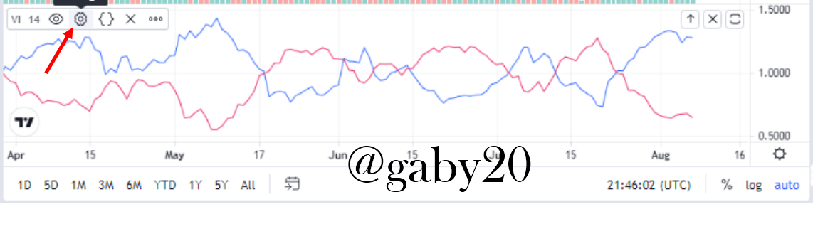 La línea VI+ indica el movimiento de tendencia alcista o positiva y usualmente se representa de color azul. La línea VI- indica el movimiento bajista o negativo y se representa de color rojo. Estas líneas oscilan entre si y al cruzarse indican el cambio en la tendencia general del mercado, esto nos permite identificar los momentos propicios para comprar o vender.